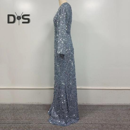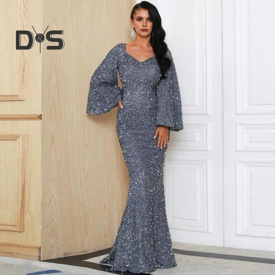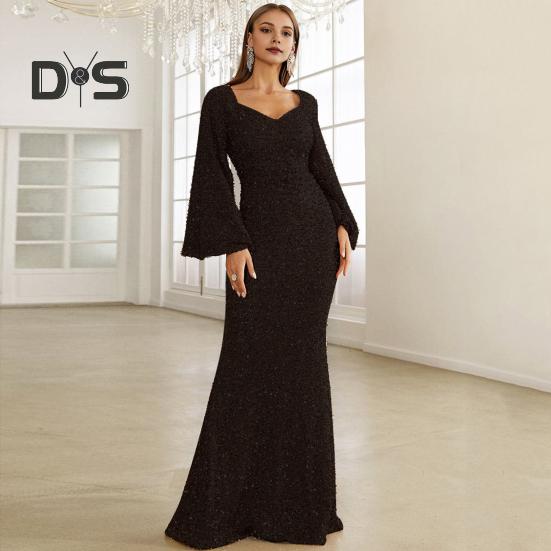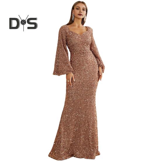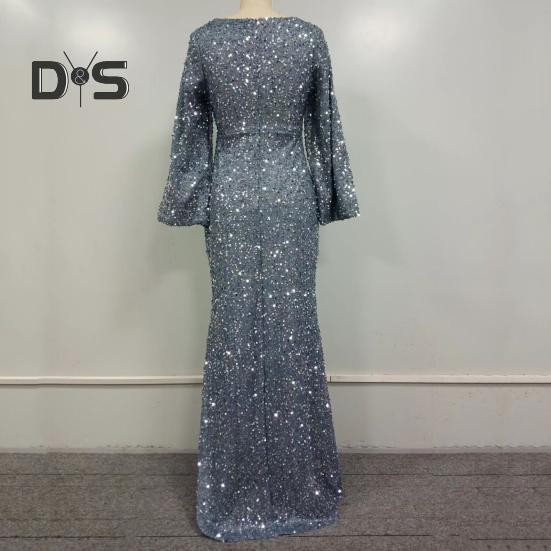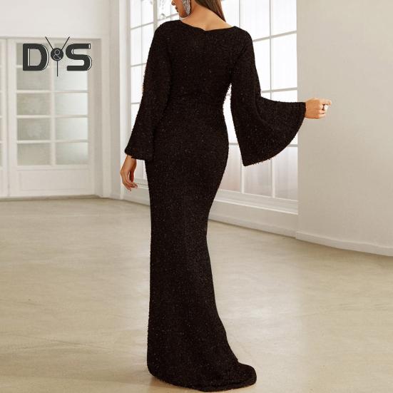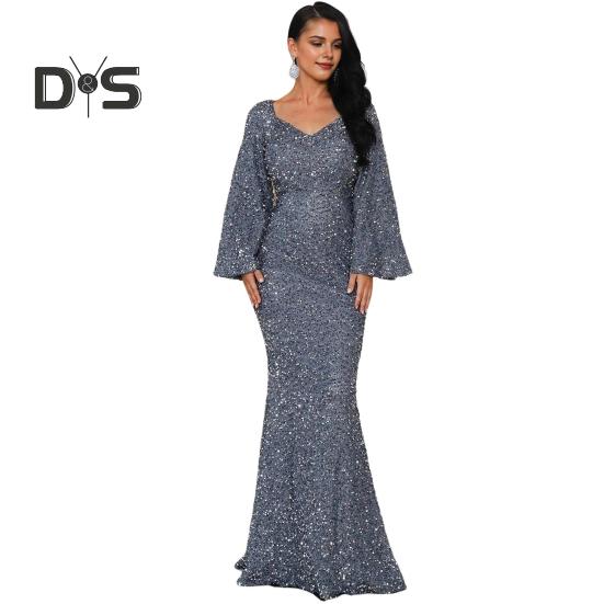 Это элегантное женское вечернее платье просто необходимо для особых случаев, таких как вечеринки, танцы, банкеты и свадьбы.. Это платье, изготовленное из высококачественного полиэфирного волокна с блестками, излучает изысканность и стиль.. Удлиненный силуэт с облегающим кроем подчеркивает вашу фигуру, а V-образный вырез и рукава-колокольчики добавляют нотку элегантности..