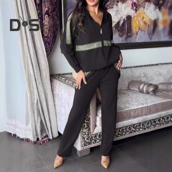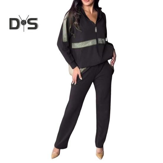 Подчеркните свой стиль с помощью этого шикарного женского комплекта из двух предметов: спортивной толстовки с капюшоном и брюками, расшитых пайетками.. Повседневная толстовка с длинными рукавами, капюшоном и застежкой-молнией обеспечивает модный образ, который идеально подходит для осени и зимы.. Удобный крой подчеркивает ваш силуэт, делая его универсальным дополнением к вашему гардеробу.