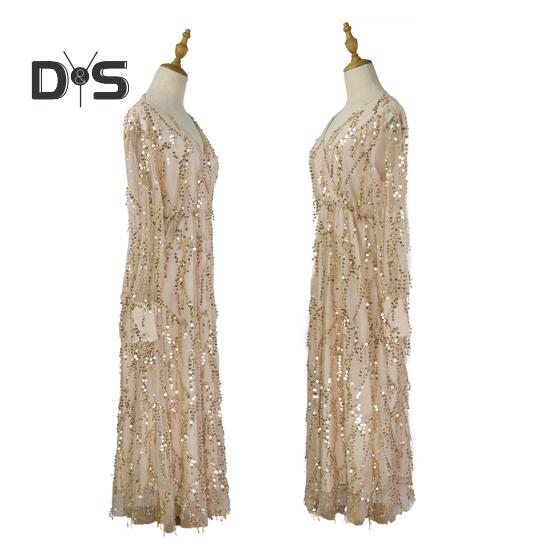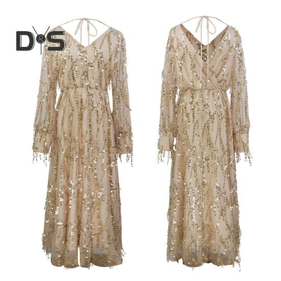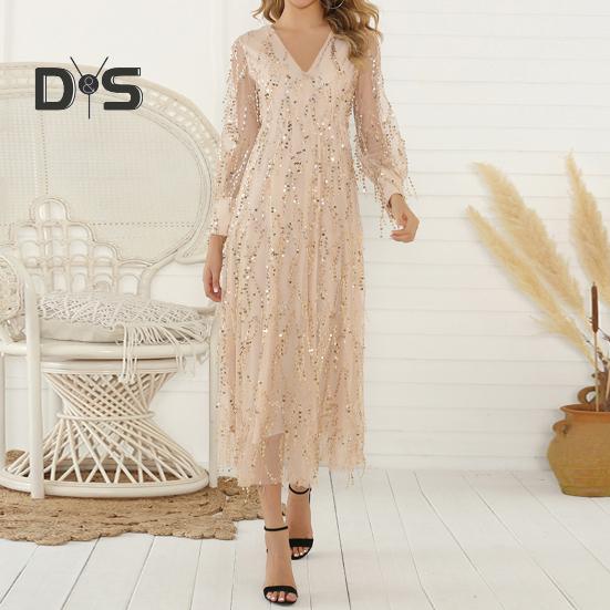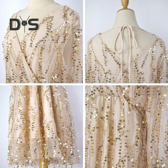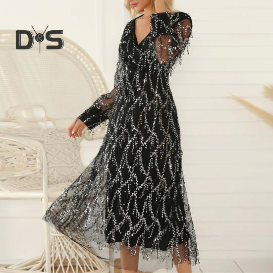 Дополните свой гардероб этим элегантным платьем А-силуэта, которое идеально подойдет для различных случаев: повседневного ношения, вечеринок, свиданий и многого другого.. Платье имеет двухслойный дизайн с сетчатым внешним слоем, украшенным пайетками, что придает ему изысканность.. Длинные рукава, V-образный вырез и регулируемые бретели сзади придают образу нотку универсальности..