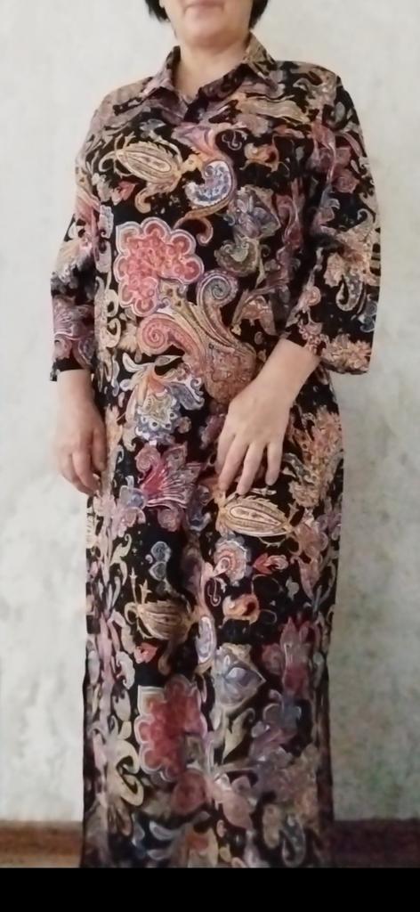 Благодарю продавца и службы доставки. Ждала долго, но всё пришло целым и невредимым. Всё упаковано аккуратно, даже при транспортировке пакет пришёл без повреждений. С размером угадала. Русский размер 50-52.Из-за_обьема(_груди_107-109)_всегда_приходится брать на размер больше. Объём талии-91, бёдра-_110-112.(для пояснения ☺) Платье понравилось. Ткань-шелк, приятный тактильно (думала текстура ткани другая, представляла, что оно плотное), но понравилось. Цвет как на картинке. Рисунок яркий. Длинное. На мой рост 160см.одела_туфли_с_каблучком-6см. Наверное немножко придётся укоротить, а может и не буду. Подумаю. 😉 Но платье понравилось. Благодарю за аккуратную доставку и хороший товар.