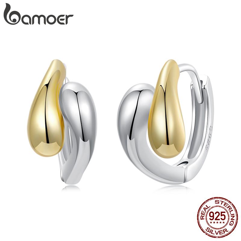BAMOER 18K Gold Двухцветные серьги-кольца из стерлингового серебра 925 пробы с каплями воды для женщин Массивные модные серьги с витыми звеньями Ювелирный подарок