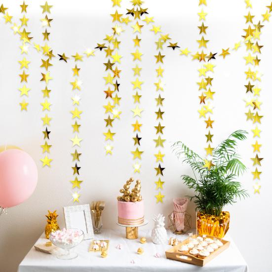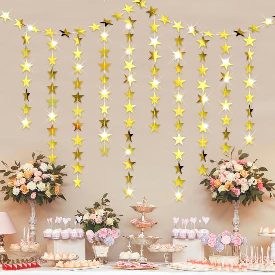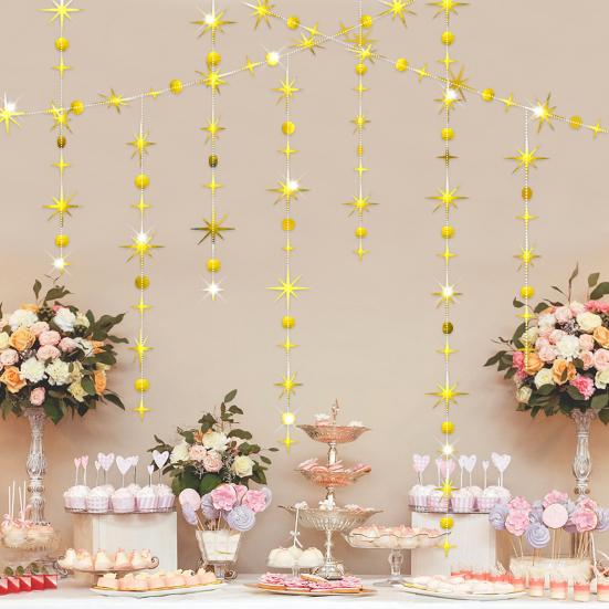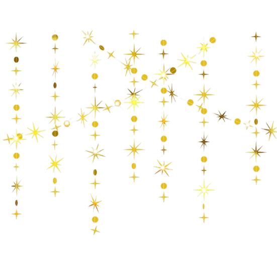 Добавьте блеска и элегантности вашему празднику с помощью этих подвесных украшений.. Изготовленные из надежной крафтовой бумаги, эти подвесные ленты предназначены для многократного использования и сшиты нитками для легкой сборки.. Блестки не осыплются, что гарантирует их повторное использование для следующего праздника.. Каждая точка или звезда имеет отражающий блеск и сверкающий эффект, что делает их идеальными для подвешивания под камином, разложения на столе или использования в качестве изящной занавески.. Благодаря наличию различных стилей вы можете использовать их по отдельности или комбинировать с баннерами, чтобы создать уникальное украшение, которое соответствует вашему вкусу.