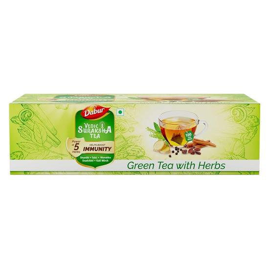 Carbamide Forte Dabur Vedic Suraksha Зеленый чай – 100 чайных пакетиков предлагает гармоничное сочетание зеленого чая и пяти традиционных аюрведических трав, обеспечивая освежающий и полезный напиток.. Этот чай создан для поддержания общего благополучия и жизненной силы.