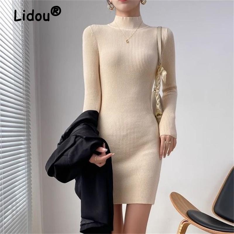 Осень-зима Женские корейские модные простые ребристые трикотажные платья Элегантное полувысокое воротниковое длинное облегающее базовое платье-свитер