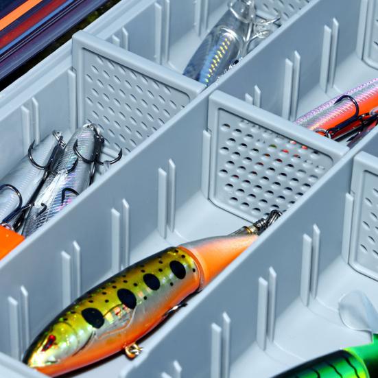 Универсальная организация: Этот многофункциональный ящик для приманок с просторным внутренним пространством и съемной перегородкой предлагает большую вместимость и настраиваемые отсеки для эффективного размещения различных рыболовных снастей.