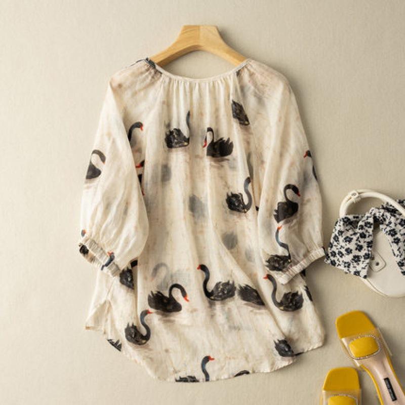Летняя литература свободная хлопковая льняная рубашка с принтом V-образным вырезом и рукавами пять четвертей женская рубашка-пуловер — купить товар онлайн с бесплатной доставкой по всему миру!