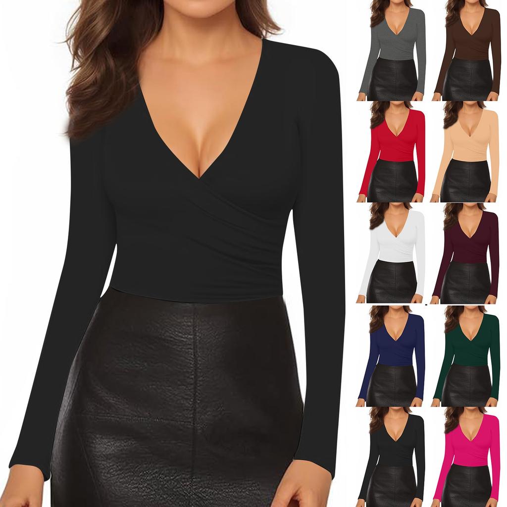 Женская и зимняя мода Тонкий V-образный вырез однотонный длинный рукав нижняя часть вниз рубашка свитшот топ
