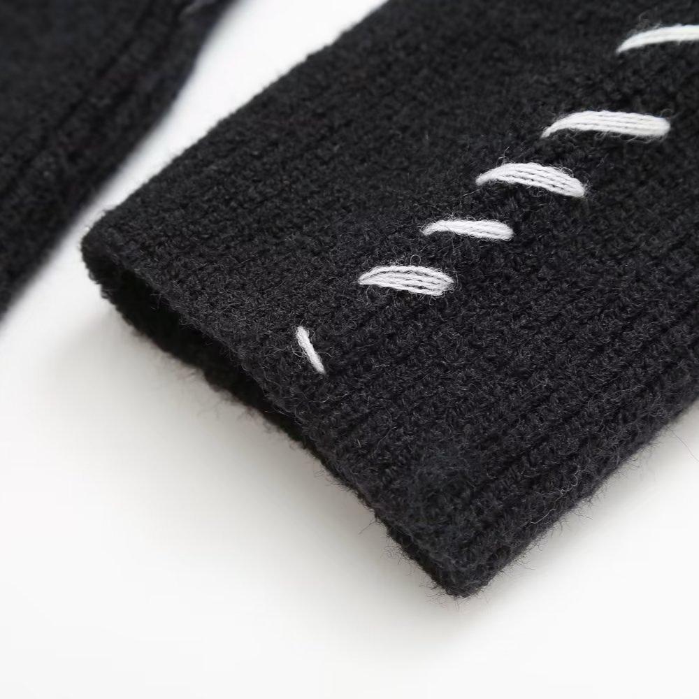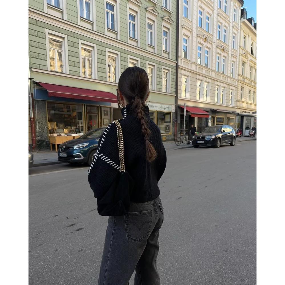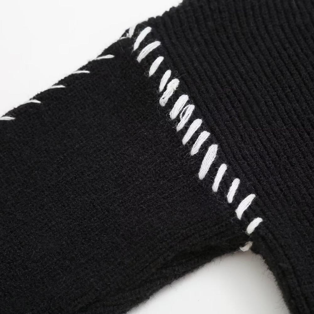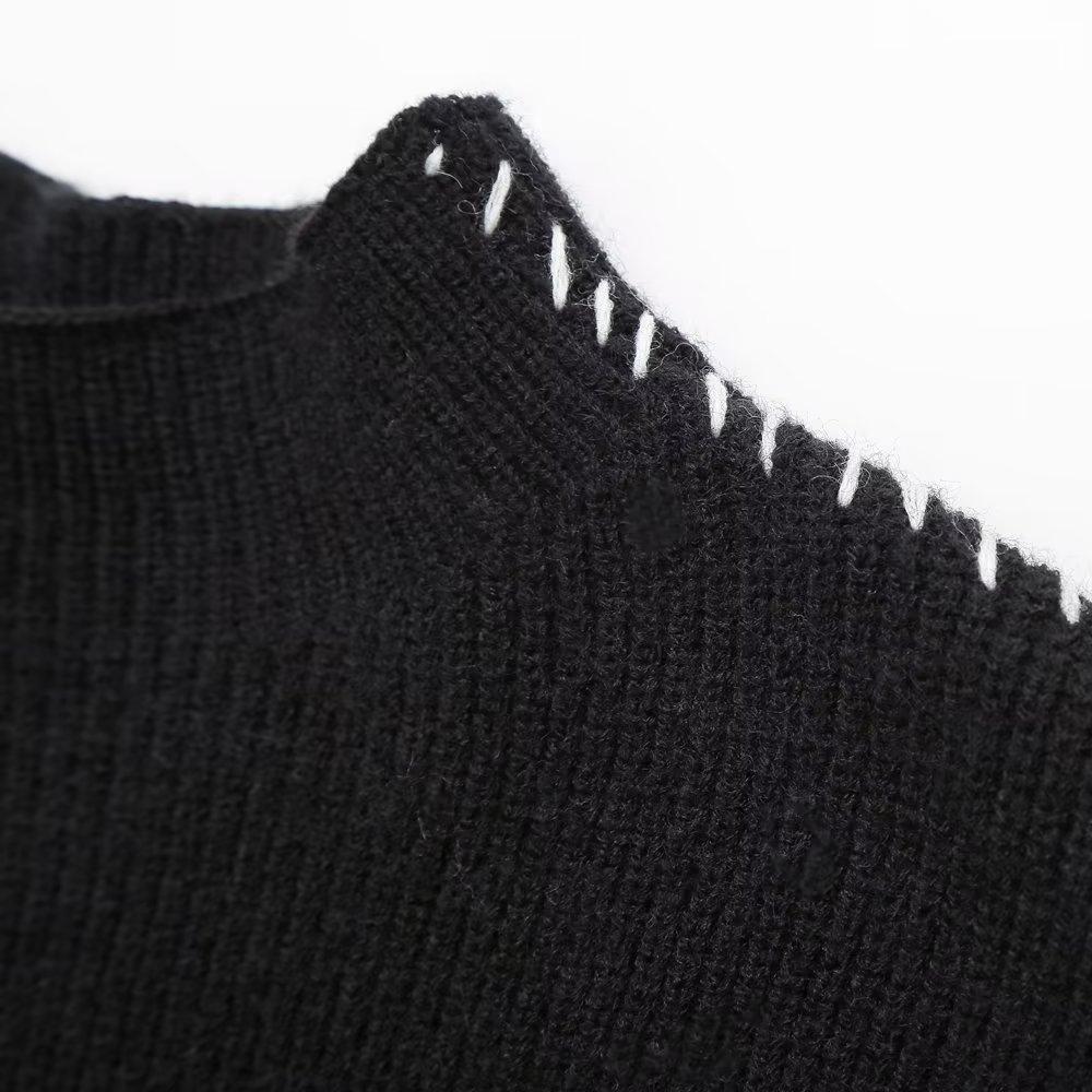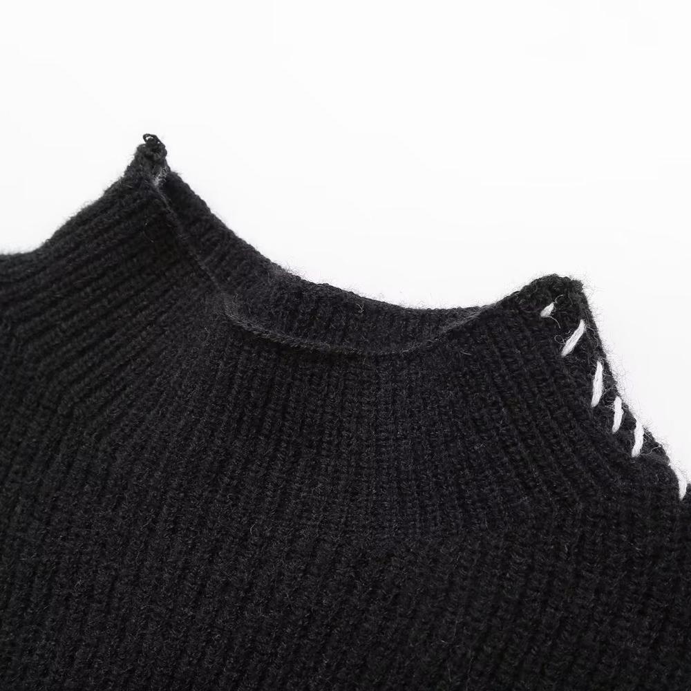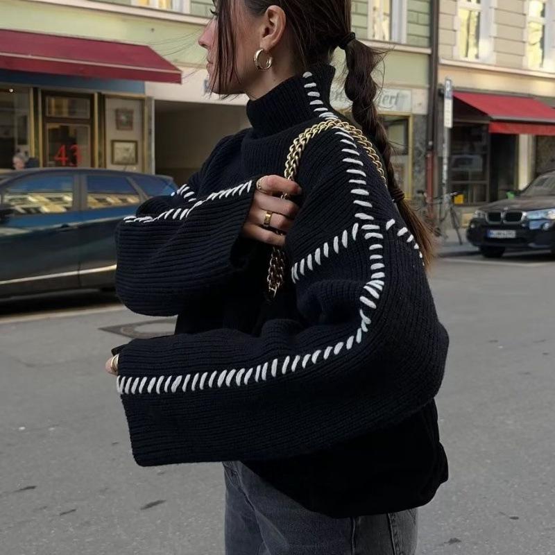 2024 осень и зима новый женский свитер с круглым вырезом вязаный свитер теплый универсальный контрастный цвет сращивание линия свитер