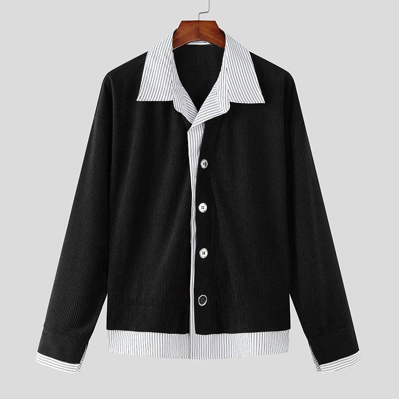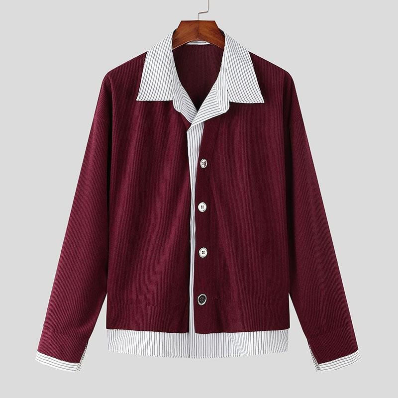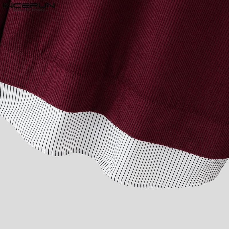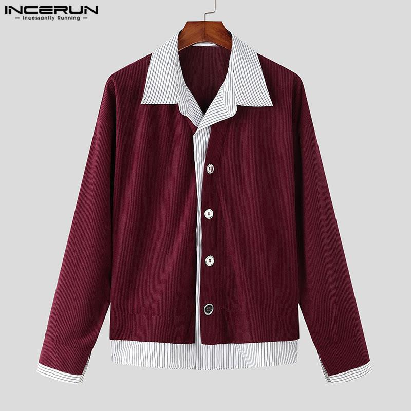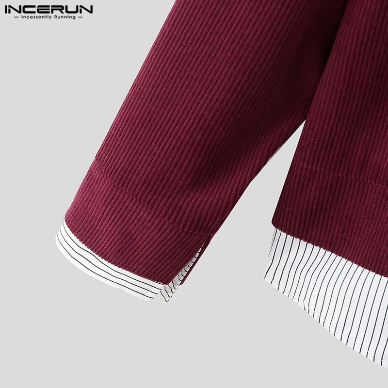 INCERUN Весенние мужские рубашки с воротником-лацканом и длинным рукавом в полоску в стиле пэчворк на пуговицах из вельвета