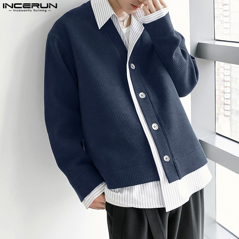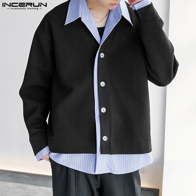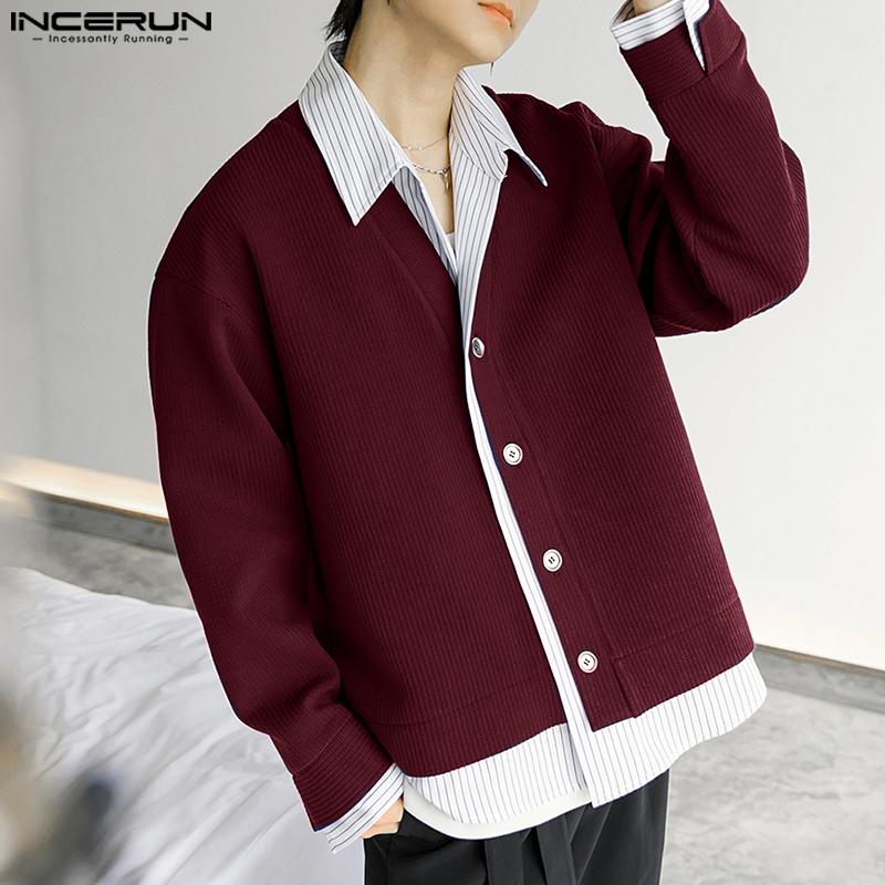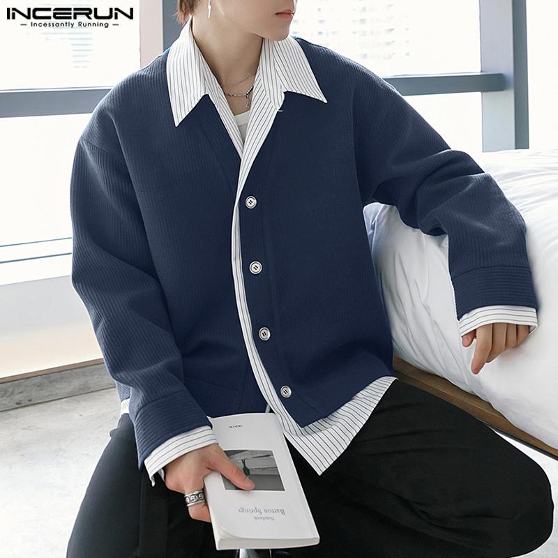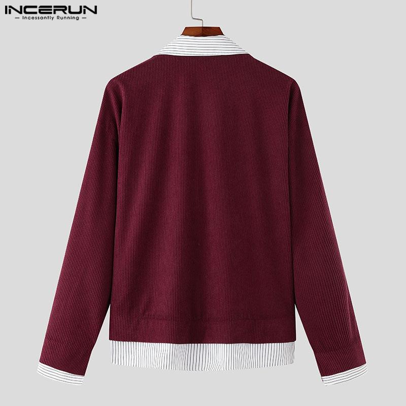INCERUN Весенние мужские рубашки с воротником-лацканом и длинным рукавом в полоску в стиле пэчворк на пуговицах из вельвета