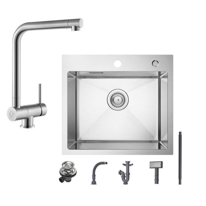 Кухонная мойка 1 чаша 50x45 см нержавеющая сталь матовая, кухонный смеситель перед окном складной