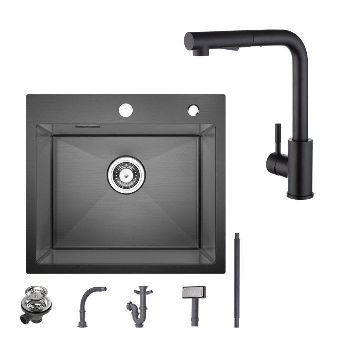 Evier cuisine 1 Bac 50×45CM inox Noir anthracite,mitigeur de cuisine extractible avec 2 Fonctions douchette