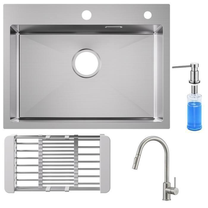 Évier de cuisine - Brossé inox - 60x45cm - Mitigeur extractible - Distributeur de savon - 1 bac — купить товар онлайн с бесплатной доставкой до всему миру!