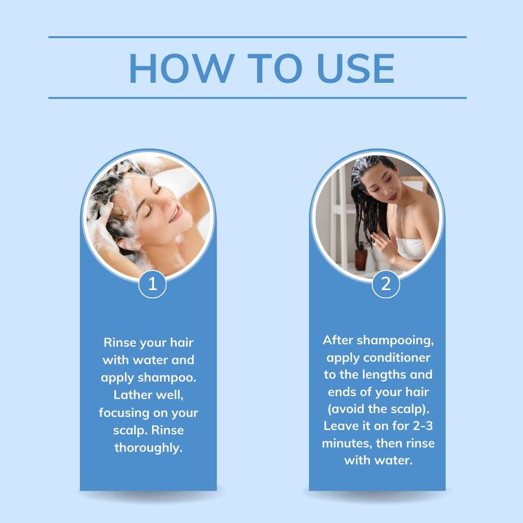 1. Шампунь: Нанесите достаточное количество средства на влажные волосы, вспеньте и тщательно смойте.
