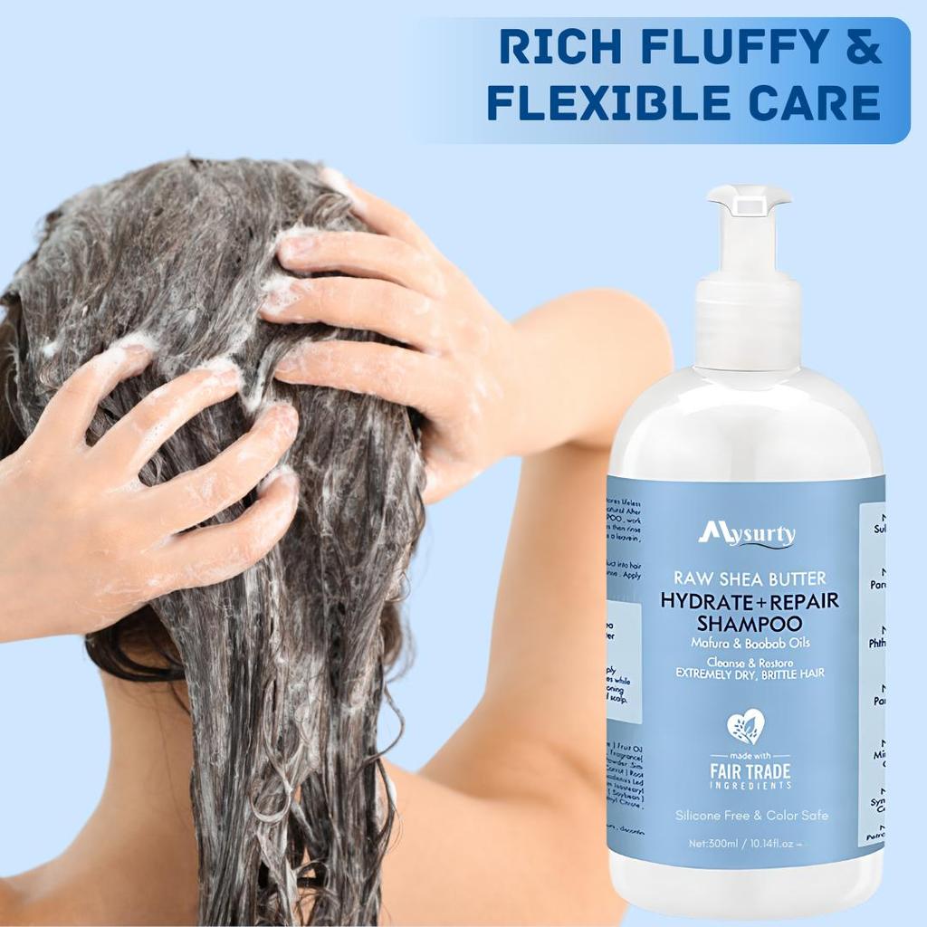 Шампунь Raw Shea Better: Обогащенный провитамином B5 и сырым маслом ши, он мягко очищает, удаляя загрязнения и излишки жира.