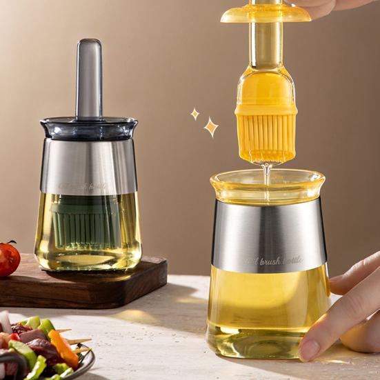 Бутылка с масляной кистью для контроля масла и здорового приготовления пищи: Этот кухонный дозатор масла со встроенным маслоскребком помогает эффективно управлять расходом масла, сохраняя чистоту в зоне приготовления пищи и столовой.. Этот дозатор масла, изготовленный из высококачественных пищевых материалов, таких как полипропилен, не содержащий BPA, силикон премиум-класса и прочное бессвинцовое стекло, обеспечивает безопасность и долговечность..