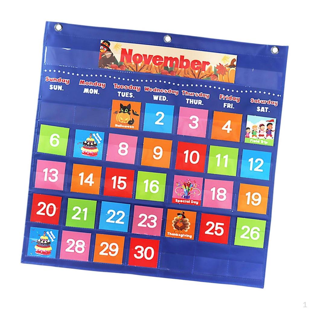 - 【Подходящий размер】: Календарь имеет размеры 64 см x 65 см и оснащен 6 рядами прозрачных карманов.. Также имеются 3 прочных металлических люверса, которые позволяют повесить эту удобную диаграмму в любом месте в классе или дома.