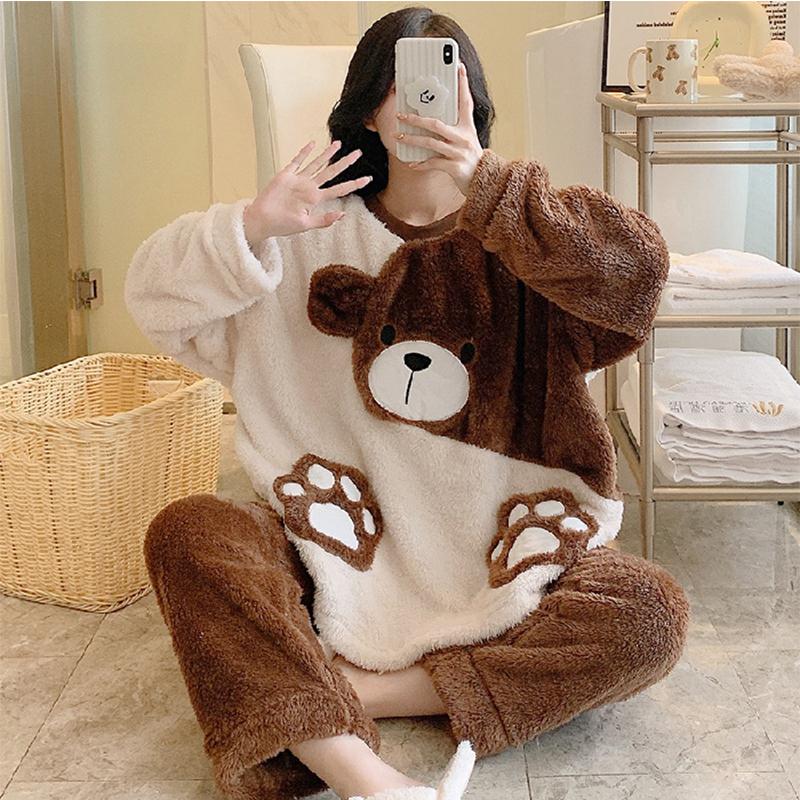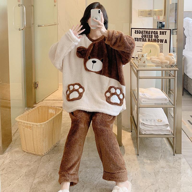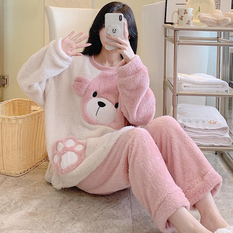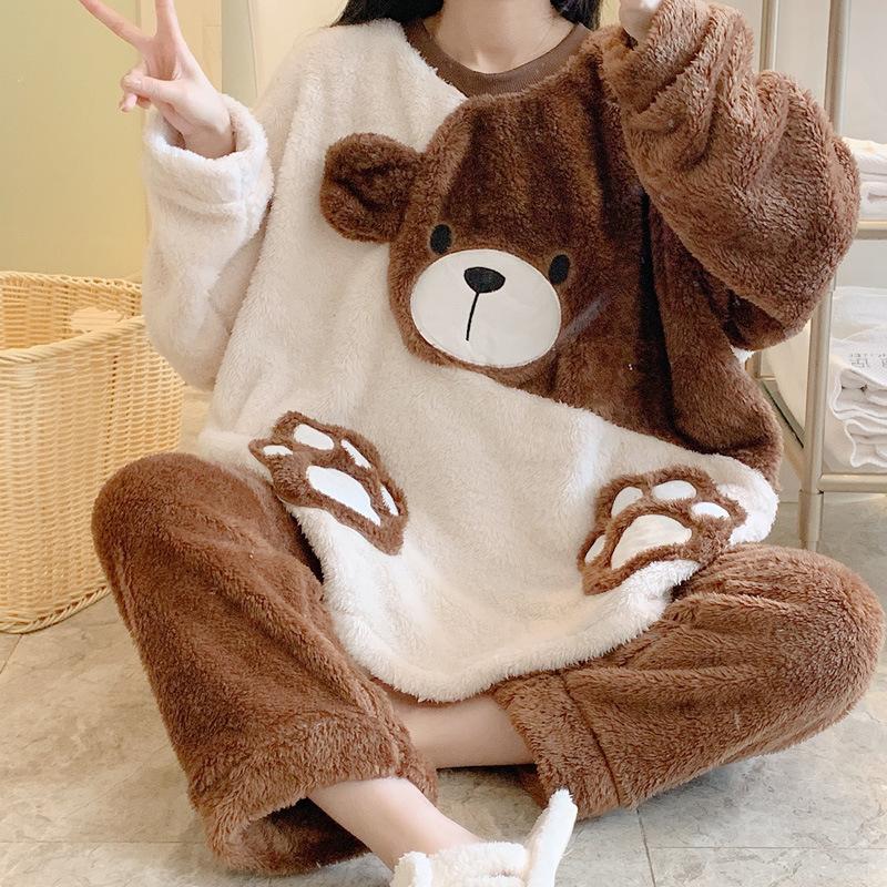 Осенне-зимний женский фланелевый пижамный комплект с милым принтом медведя, большой размер, комплект домашней одежды, пижамы для девочек, женские пижамы