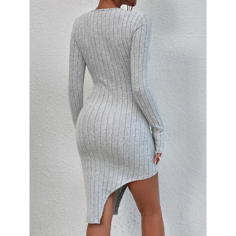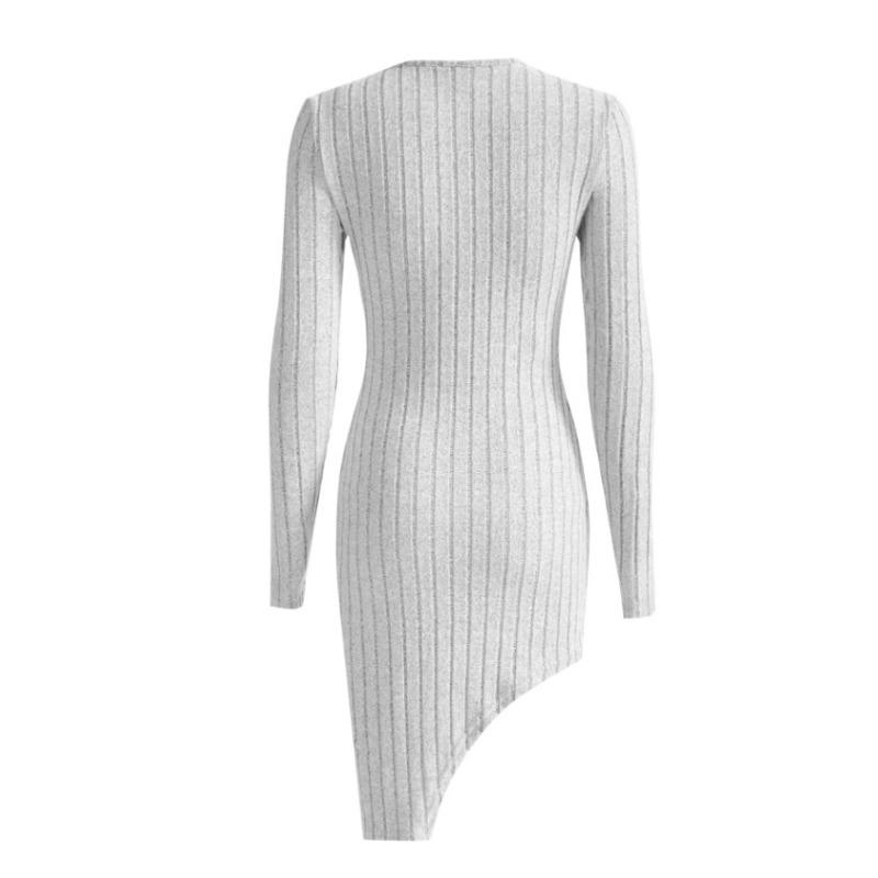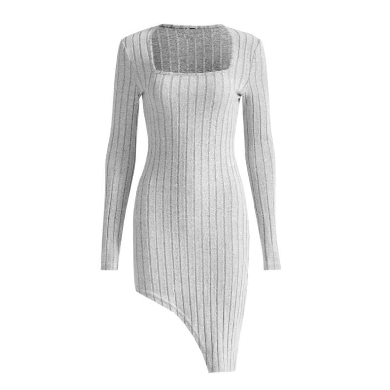 Осеннее платье с квадратным воротником, неровной талией и длинными рукавами.
