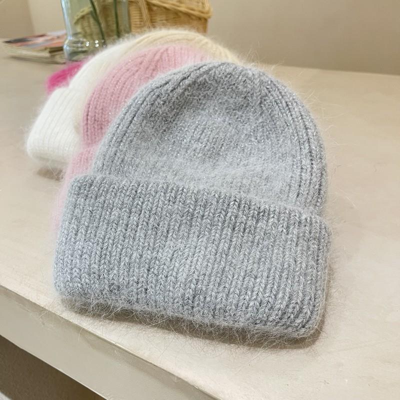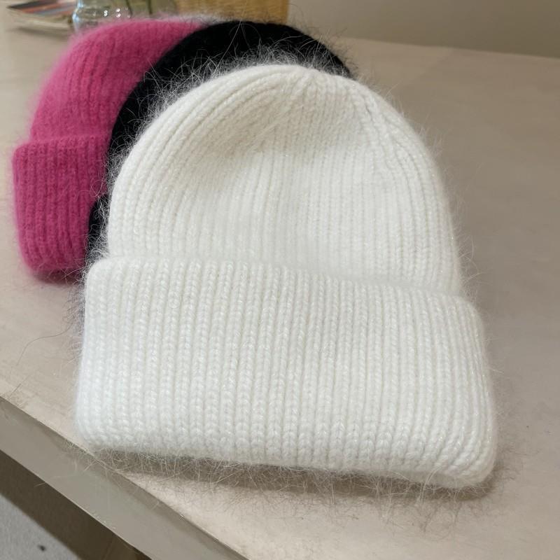 Теплая шапка из меха ангорского кролика для женщин, мягкая толстая женская зимняя вязаная шапка, модная широкая манжета, однотонная, русская лыжная брендовая шапка