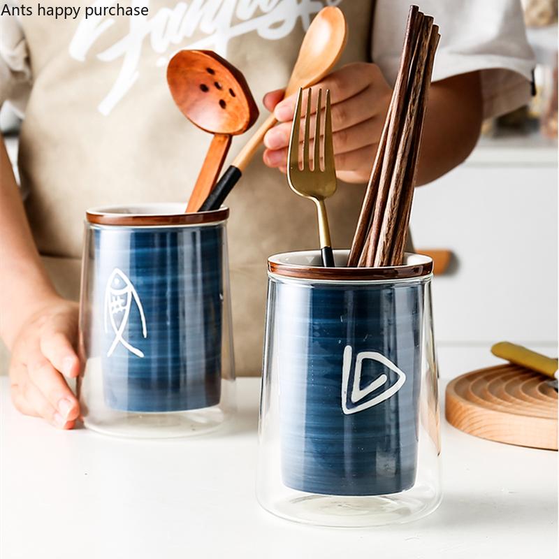 Двойной стеклянный керамический держатель для палочек для еды, кухонная банка для хранения, подставка для слива, органайзер для посуды, ящик для хранения палочек для еды, ящик для столовых приборов