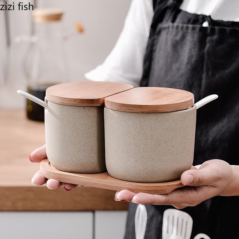 Керамические баночки для приправ, набор кухонных принадлежностей, баночка для специй, набор из 2 предметов с крышкой, ложка, коробка для приправ, бутылочки для приправ, солонка