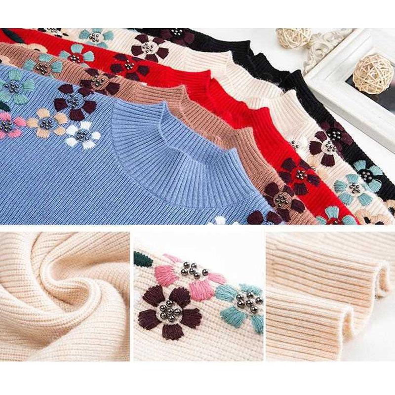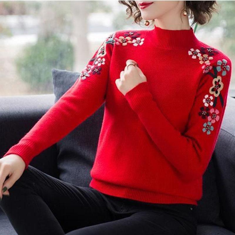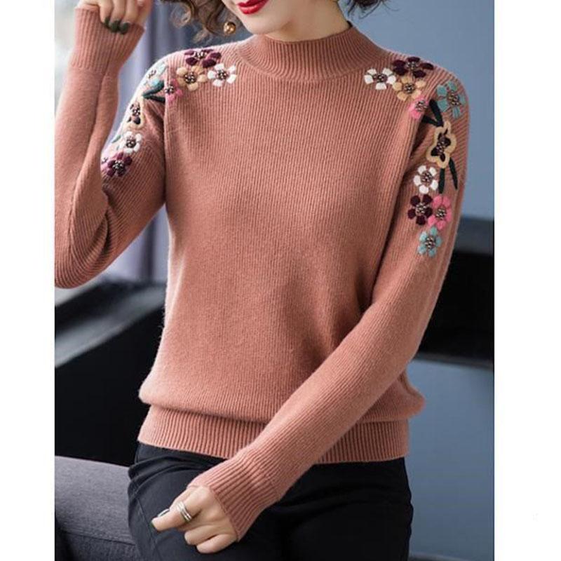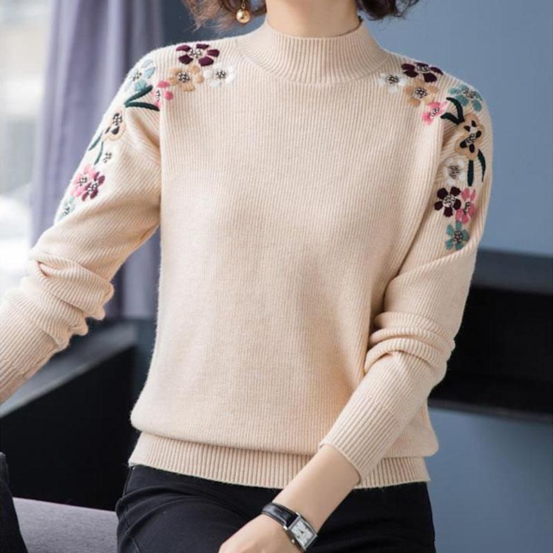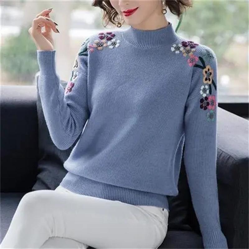 Женский свитер с вышивкой и полувысоким воротом, осень-зима, однотонный, повседневный, с длинными рукавами, свободный, мягкий трикотажный джемпер