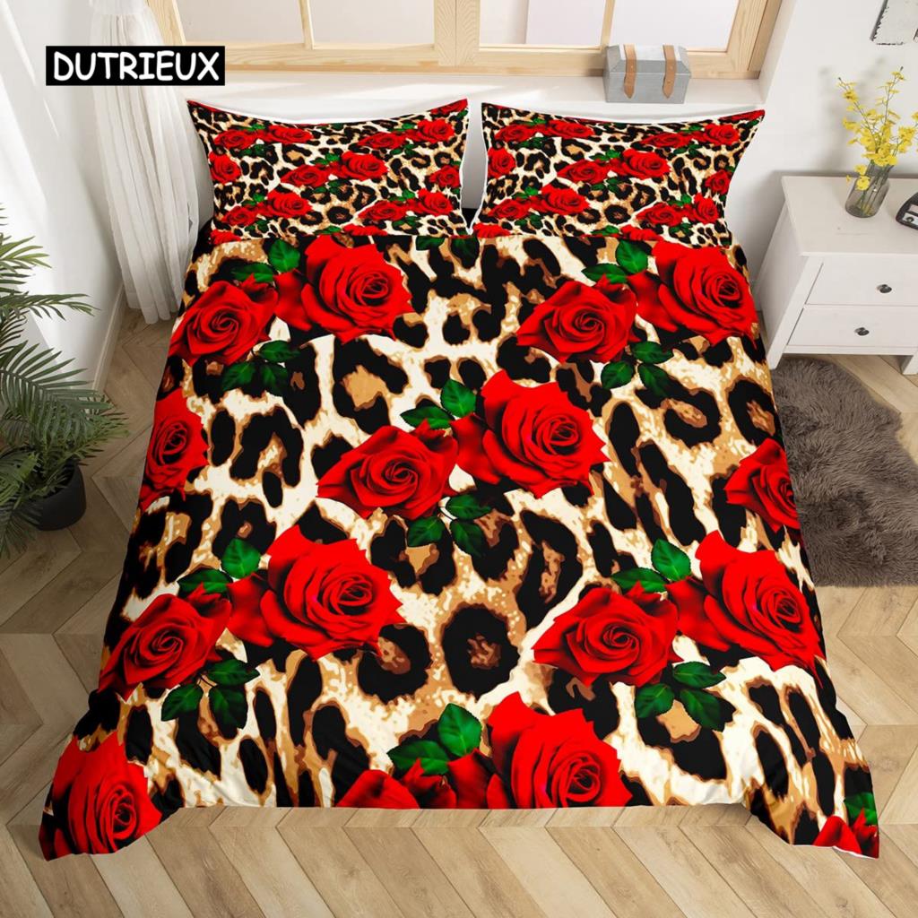 Комплект пододеяльника с леопардовым принтом, размер queen, красный цветочный лепестковый узор, чехол для одеяла, ветви, зеленый лист, принт гепарда, чехол для стеганого одеяла