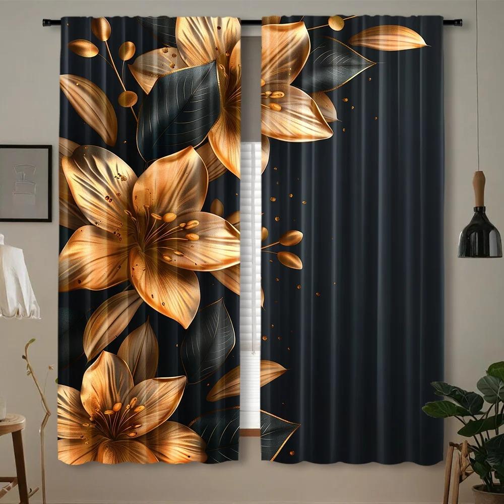 Комплект из 2 шт., золотисто-черный цветочный цифровой принт, шторы с карманами для гостиной, кухни, спальни, кабинета, современного дома