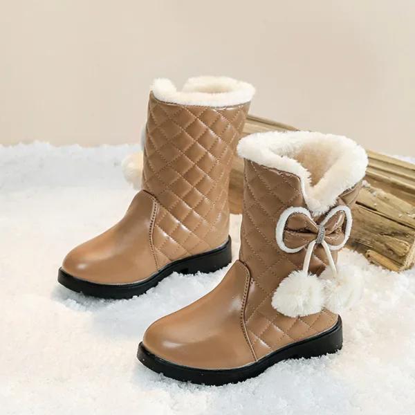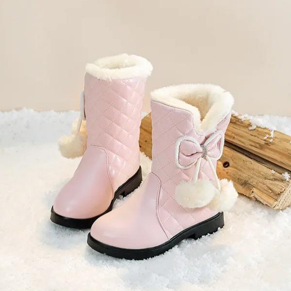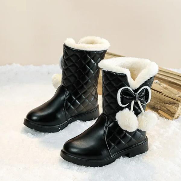 Теплые ботинки для девочек с бантом, детские зимние ботинки с мехом, плюшевые, зимние новые модные детские сапоги принцессы на водонепроницаемой платформе 2024 года