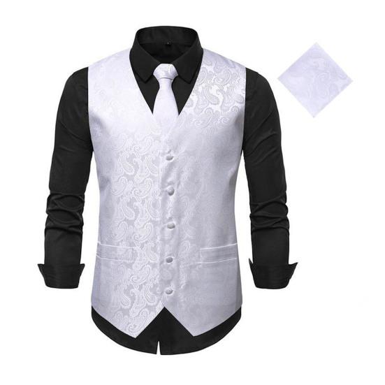 Дополните свой официальный наряд этим изысканным жилетом.. Этот комплект, предназначенный для зрелых мужчин, включает в себя жилет из трех предметов, галстук и нагрудный платок, украшенный стильным рисунком подсолнухов..
