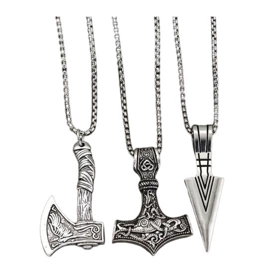 Универсальные стили: Получите три уникальных ожерелья с подвесками в стиле викингов — молот, наконечник копья и топор — каждое из которых имеет уникальные размеры.. Эти изделия из нержавеющей стали, дополненные 24-дюймовыми цепями, дополнят любой наряд, предлагая универсальность как для повседневного ношения, так и в качестве подарка на различные случаи жизни.
