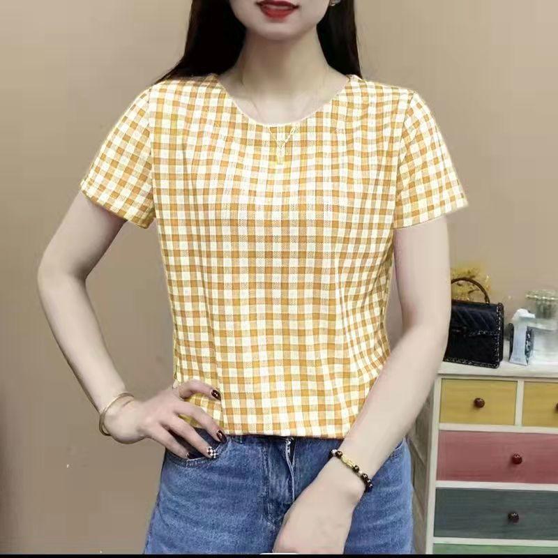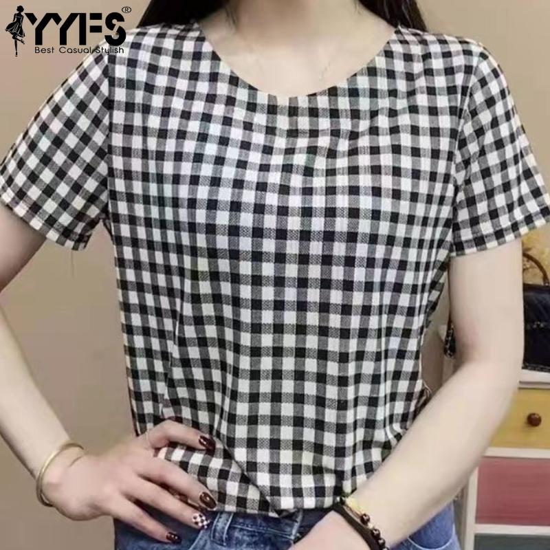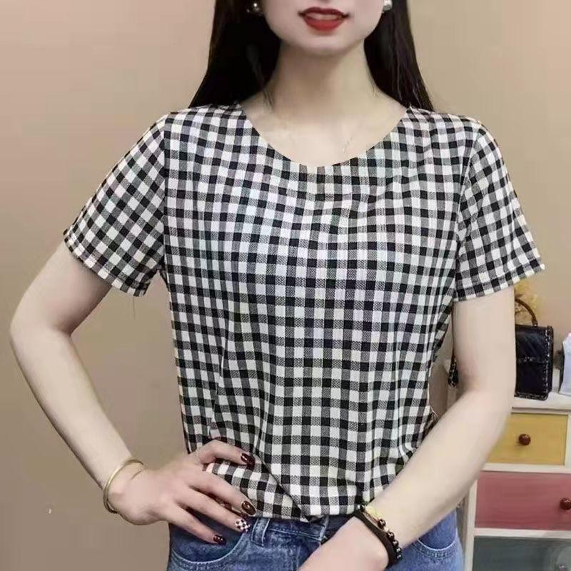 YYFS Женская мода повседневная летняя весна клетчатый принт с коротким рукавом и круглым вырезом блузки и рубашки