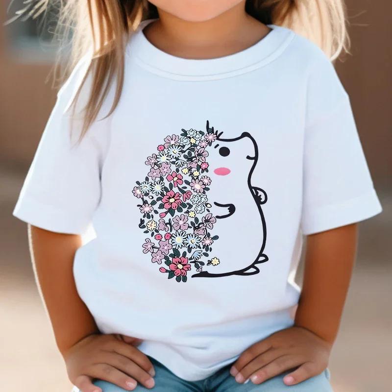 Футболка для девочек Милая футболка с изображением ежа Детские топы с рисунком из аниме Модная одежда с изображением ежа и цветка Футболка с коротким рукавом для мальчиков и девочек