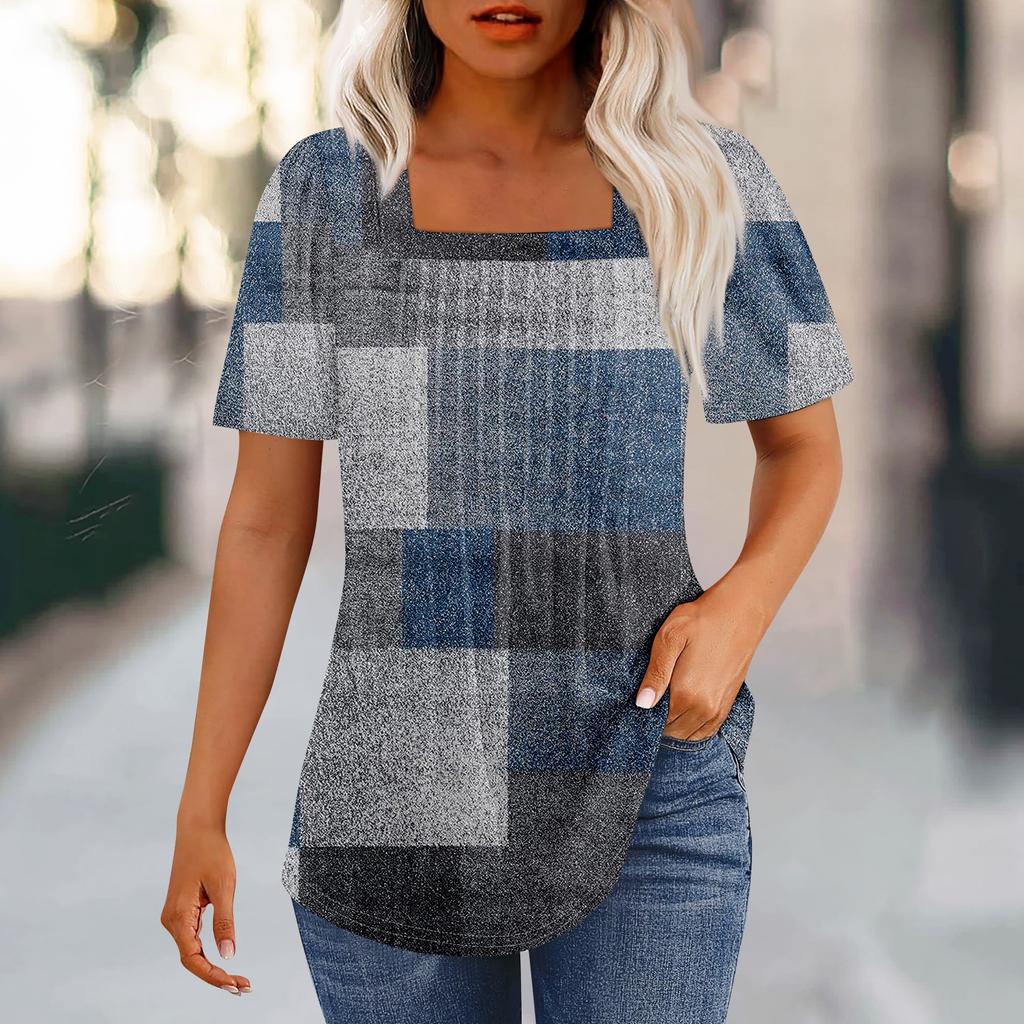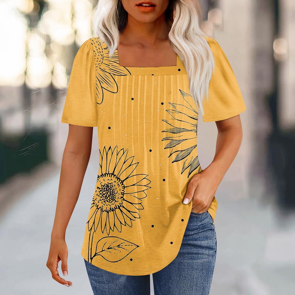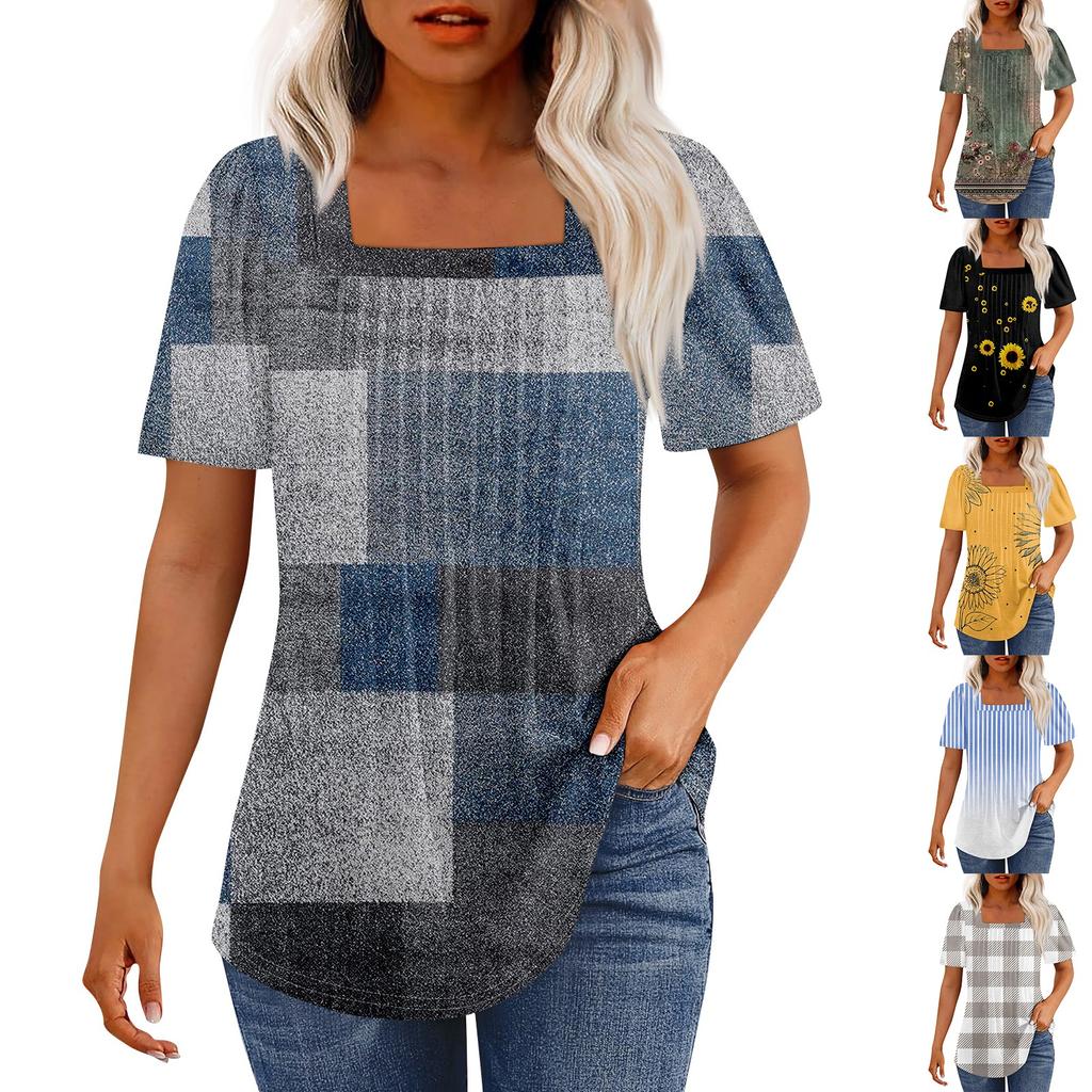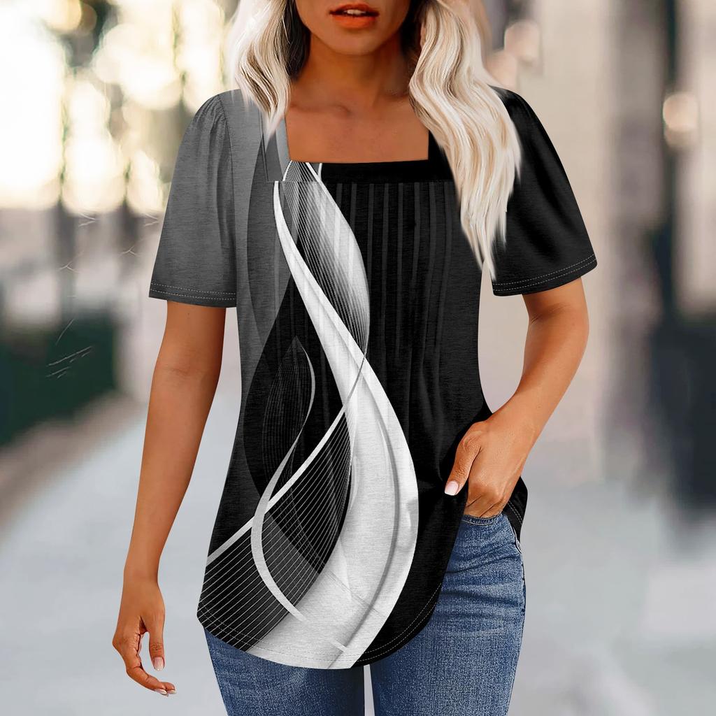 Футболки для женщин, плиссированные, с квадратным вырезом, нарядные, повседневные, блузки с принтом, с коротким рукавом, летние топы свободного кроя