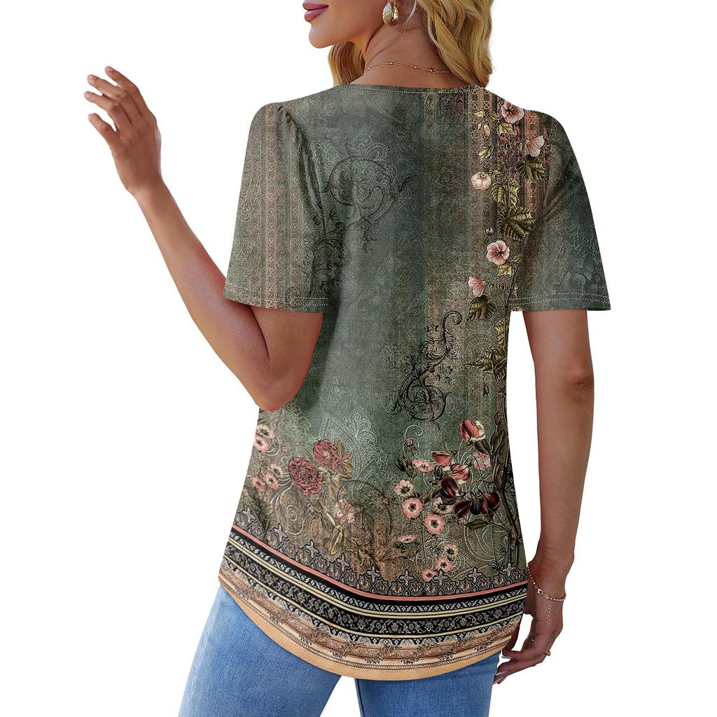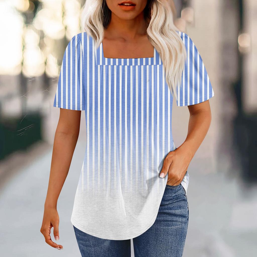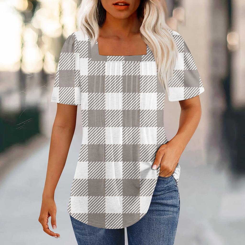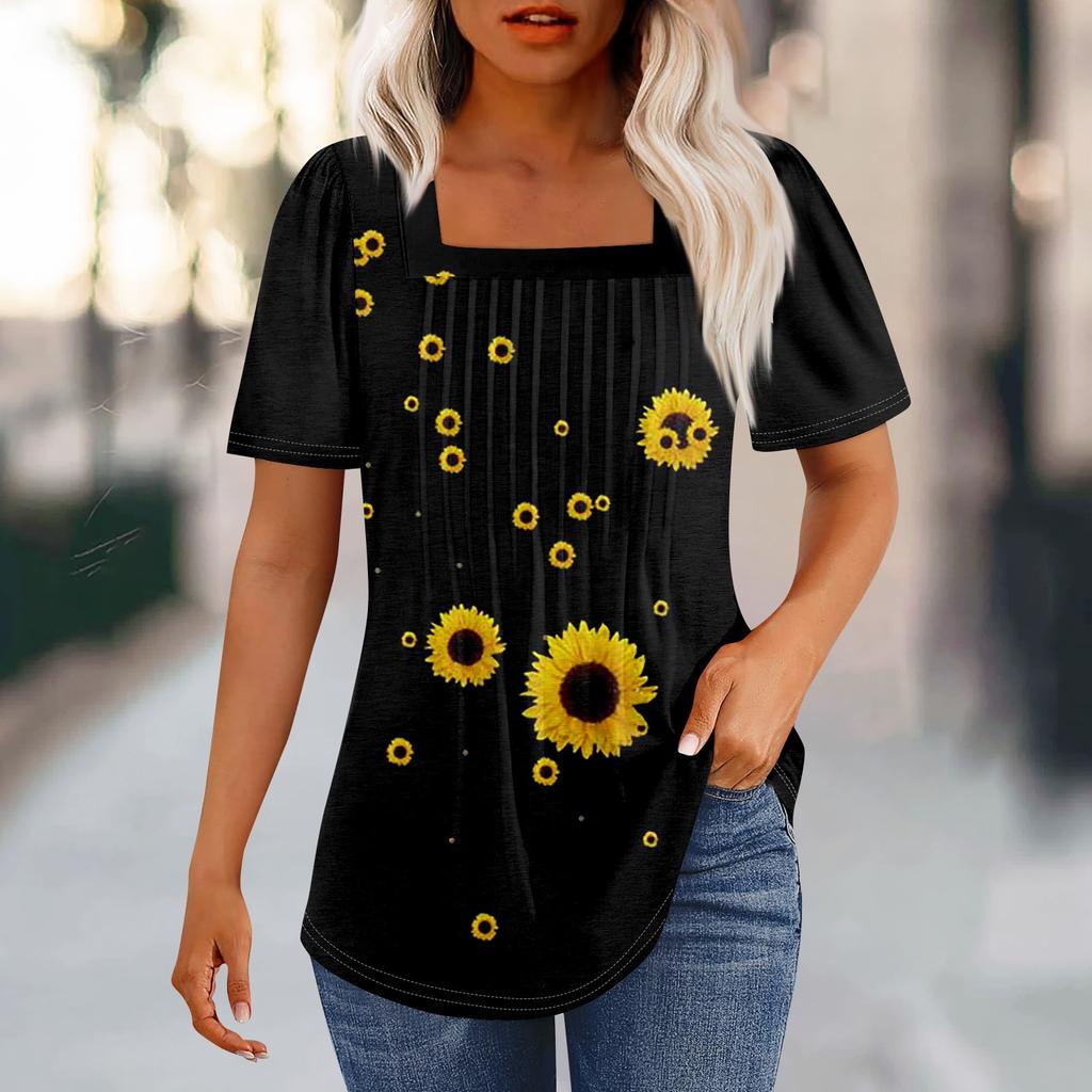 Футболки для женщин, плиссированные, с квадратным вырезом, нарядные, повседневные, блузки с принтом, с коротким рукавом, летние топы свободного кроя