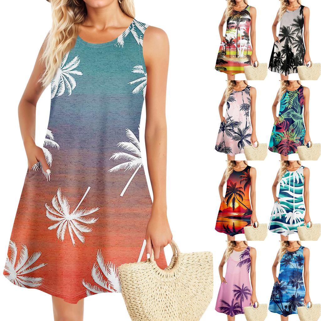 Летние платья для женщин Пляжный Бохо без рукавов Винтажный принт Футболка с карманами Сарафаны-майки