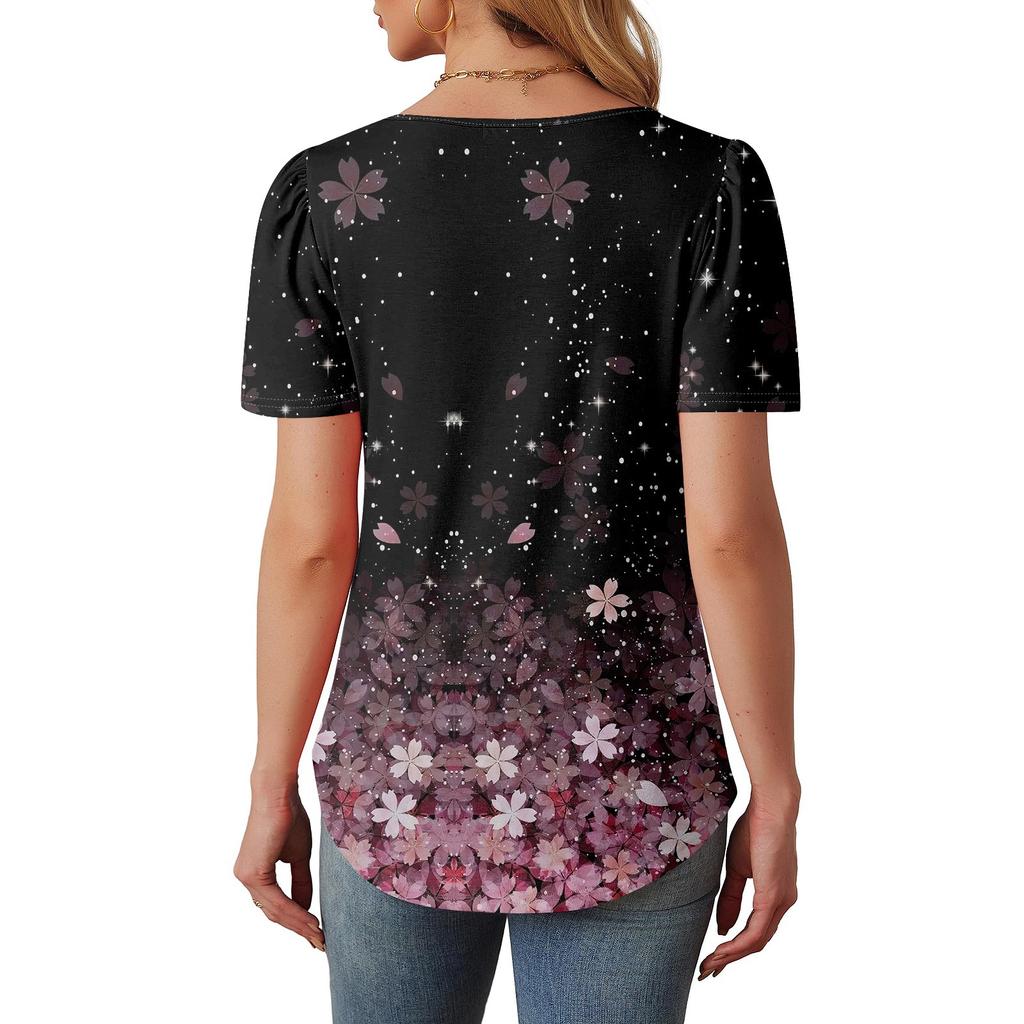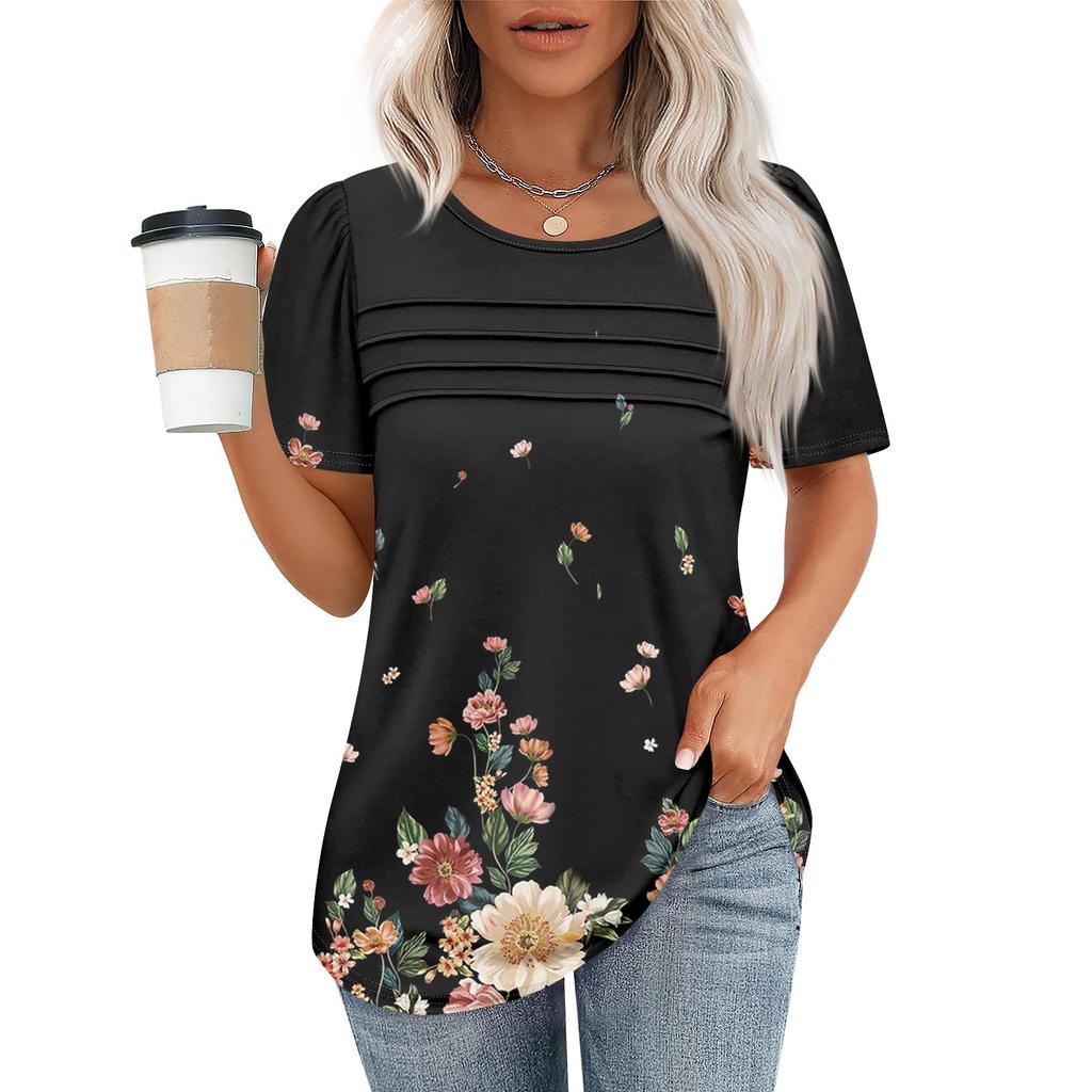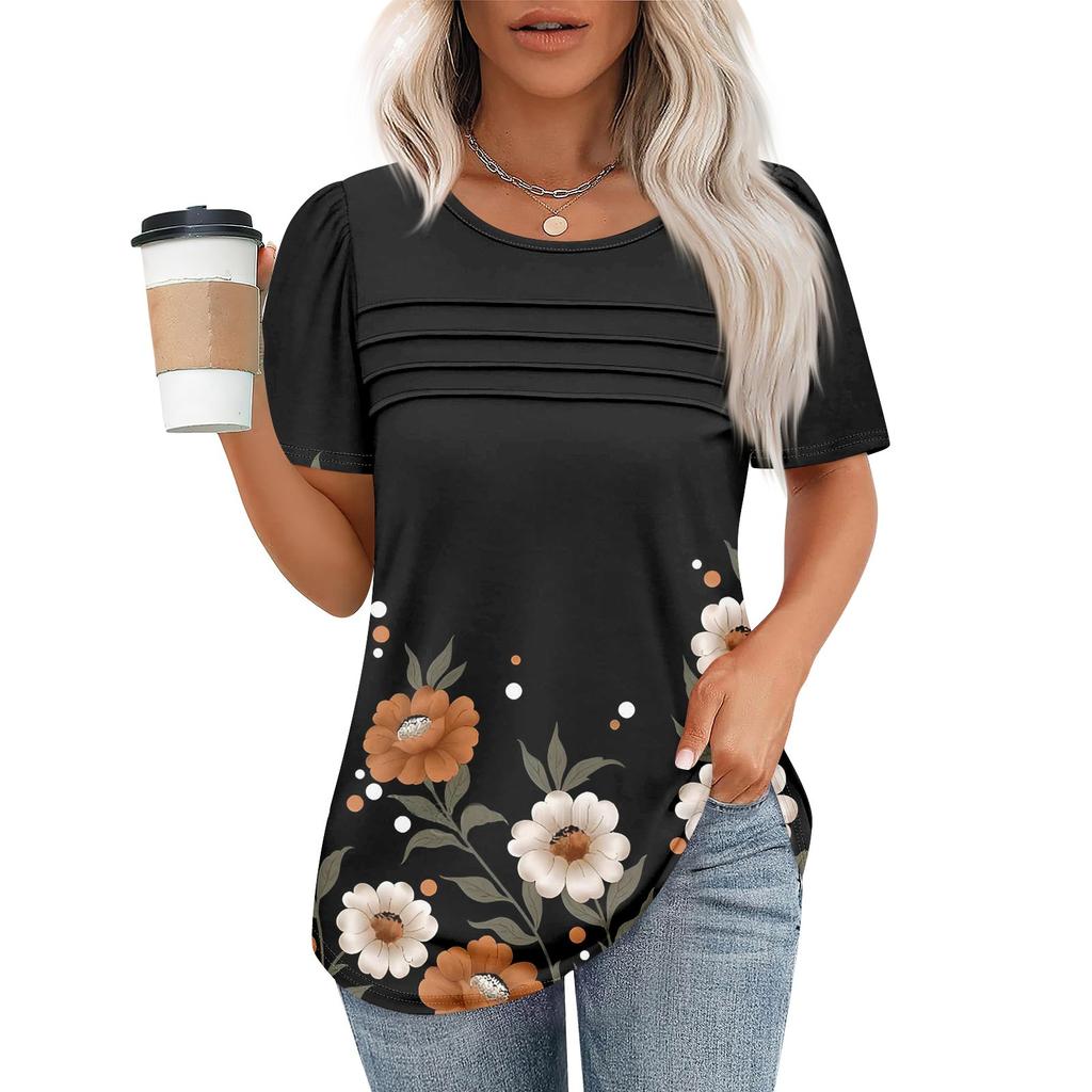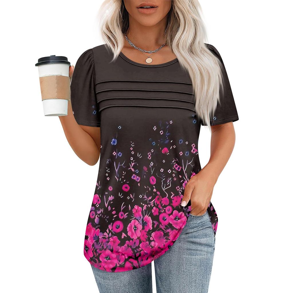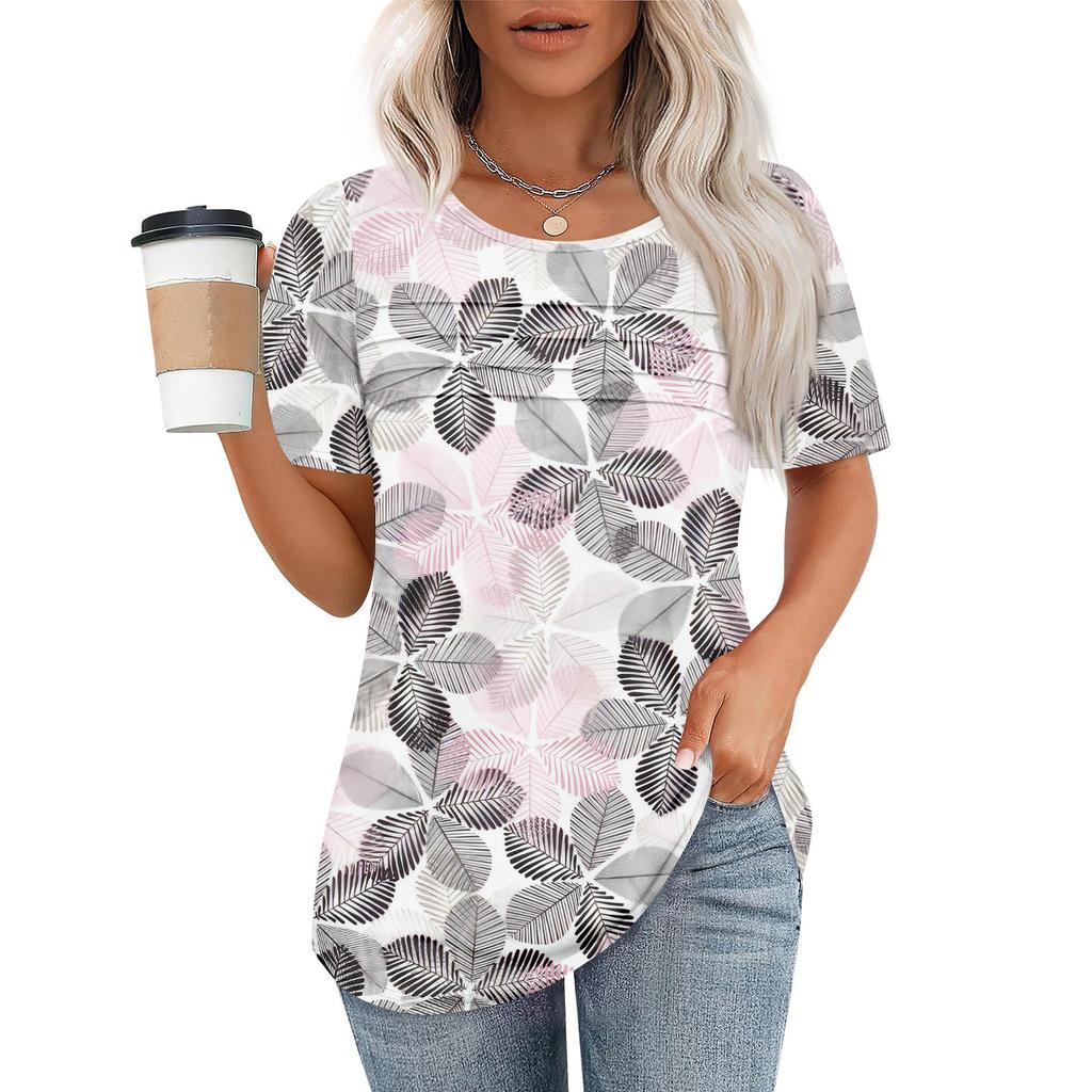 Футболки для женщин, плиссированные, с круглым вырезом, нарядные, повседневные, блузки с принтом, с коротким рукавом, летние топы, свободный крой
