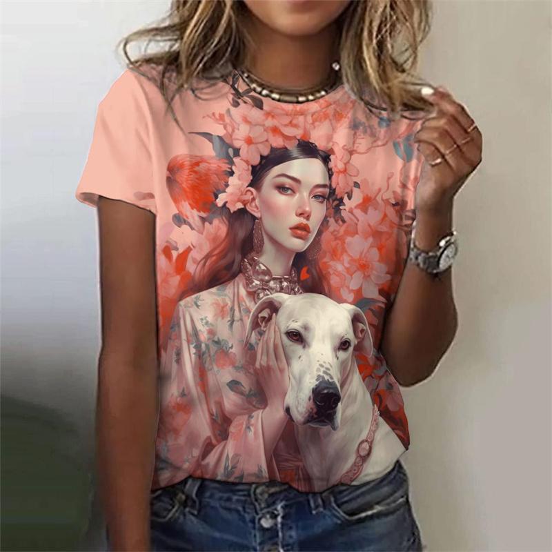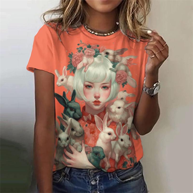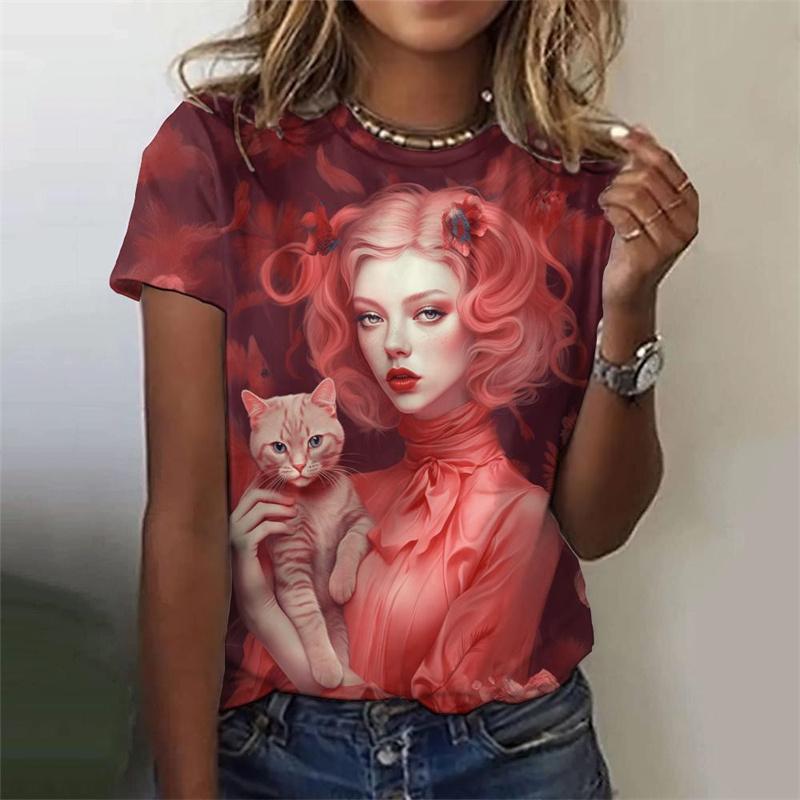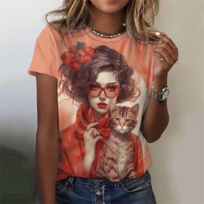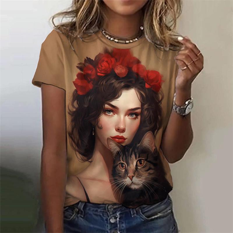 Футболка с рисунком девушки из мультфильма для женщин, футболки с 3D-принтом в виде цветка и кошки, летние свободные футболки в стиле Харадзюку с круглым вырезом и короткими рукавами