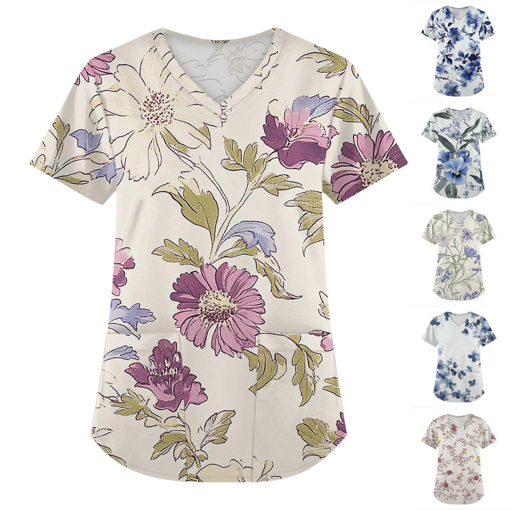 Женская мода с коротким рукавом и V-образным вырезом с карманами и цветочным принтом Топы Одежда — купить товар онлайн с бесплатной доставкой до всему миру!