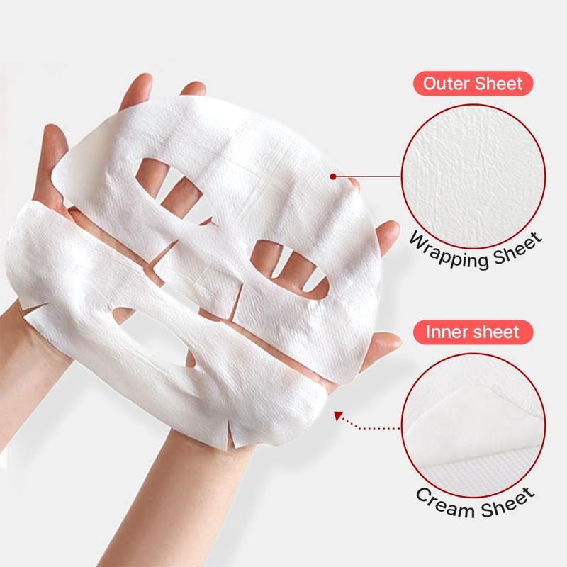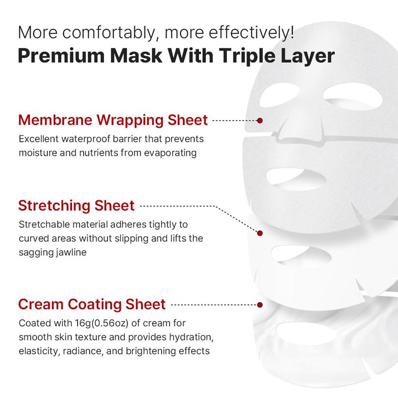 МАСКА ПРЕМИУМ-КЛАССА С ТРЕХСЛОЙНЫМИ ВЕЩЕСТВАМИ: Маска, состоящая из трех слоев: оберточной пленки, эластичной пленки и пленки, покрытой кремом, удобна в использовании и способствует лучшему впитыванию высококонцентрированного крема в кожу.
