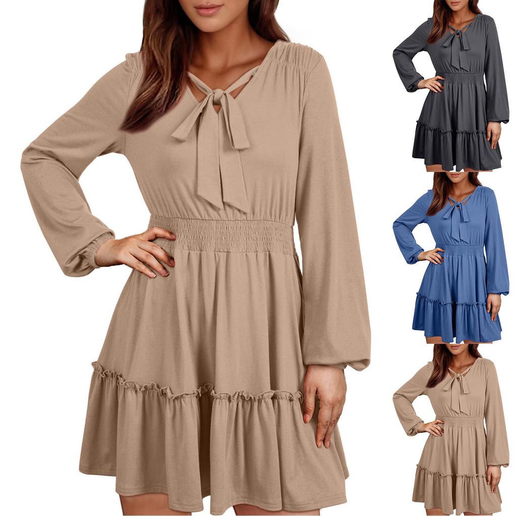Женские модные свободные повседневные платья с V-образным вырезом и плиссированными оборками и длинным рукавом — купить товар онлайн с бесплатной доставкой до всему миру!