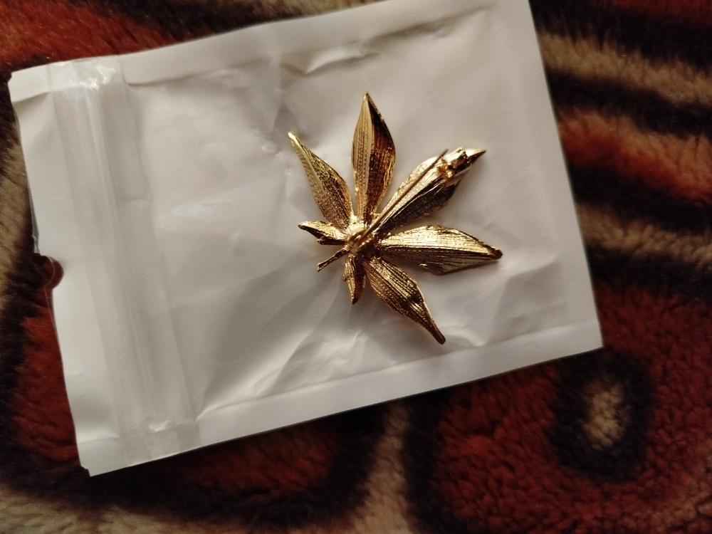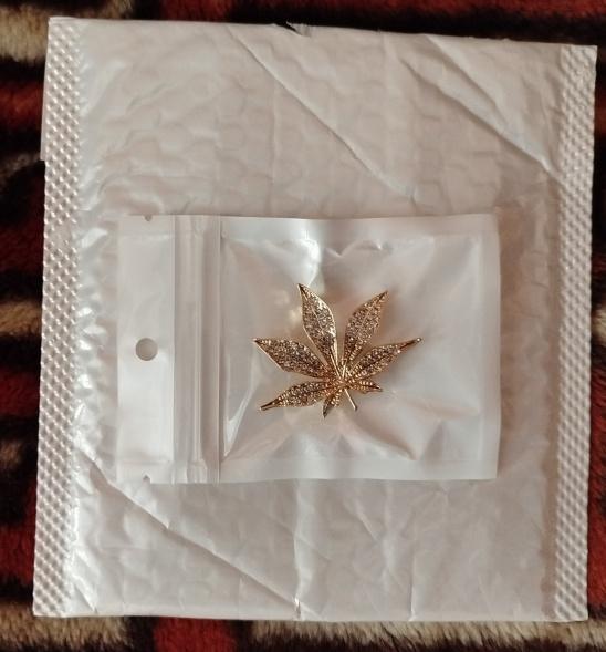 Брошь (листик то ли клёна, то ли конопли) среднего размера с надёжной застёжкой. Возможно, со временем она потемнеет, но пока выглядит красиво - усыпана мелкими белыми камешками и сверкает. Фото 2 - обратная сторона. Была на финише (то есть получена) первой, значительно обогнав все другие заказы. :)