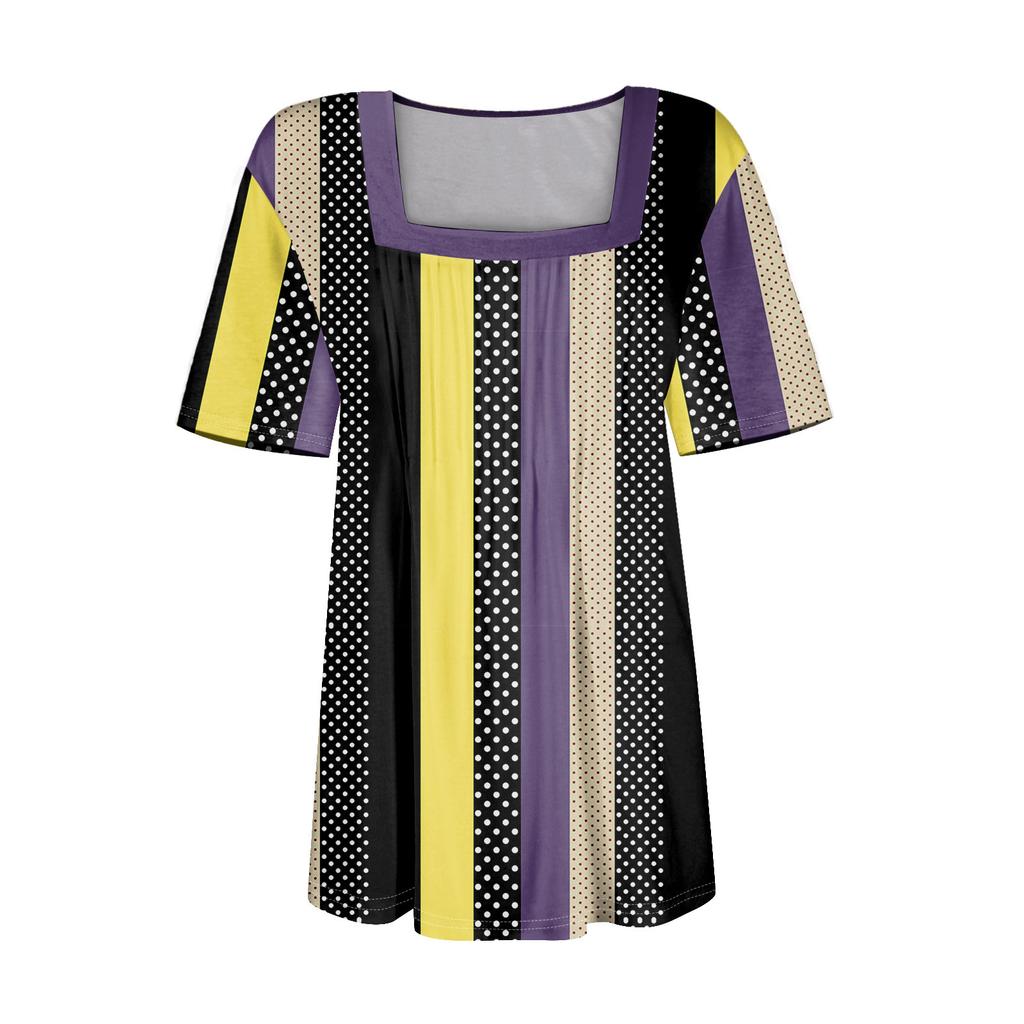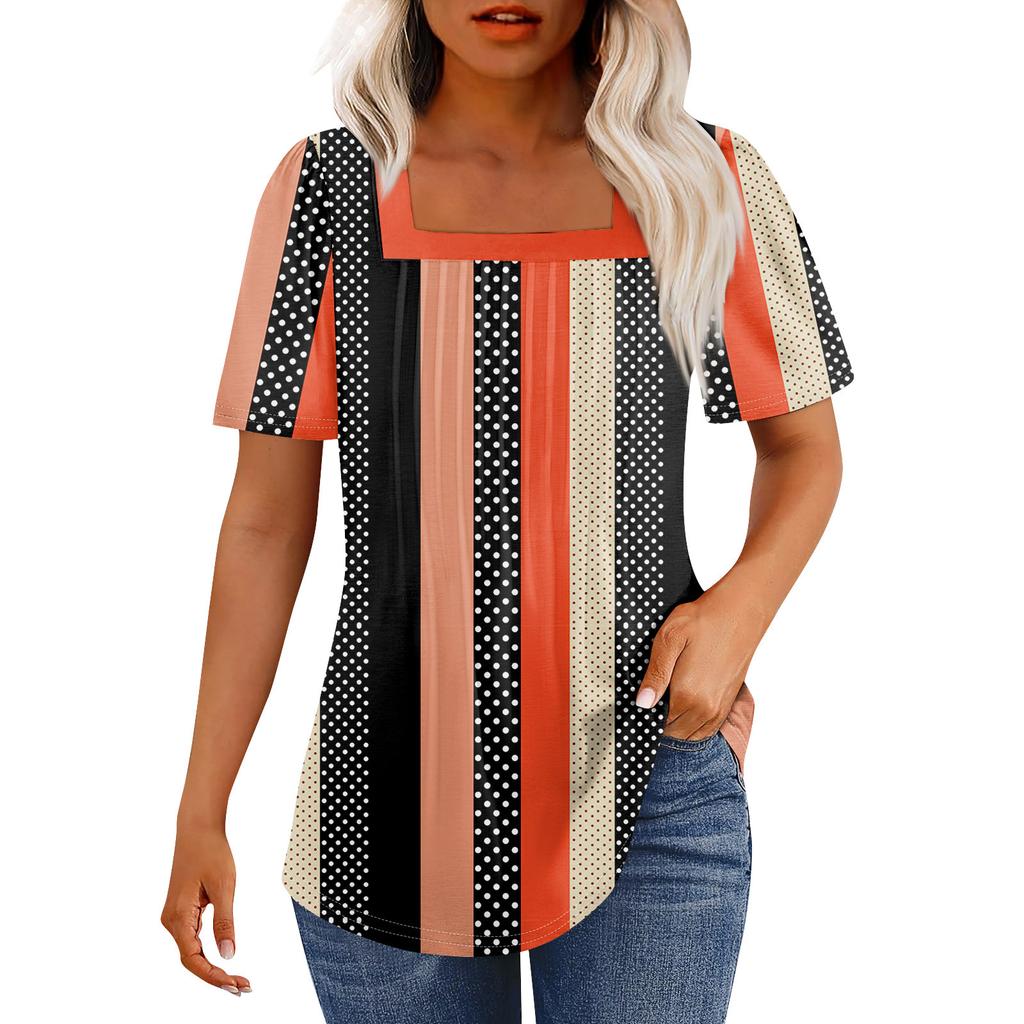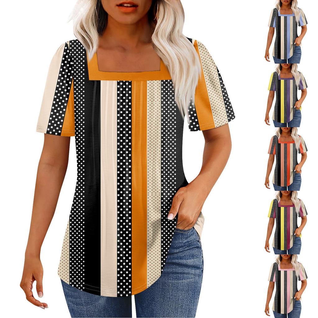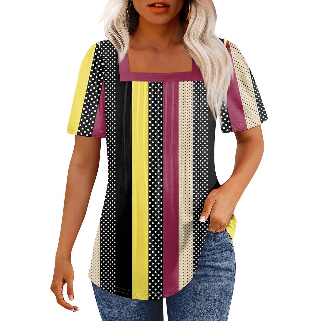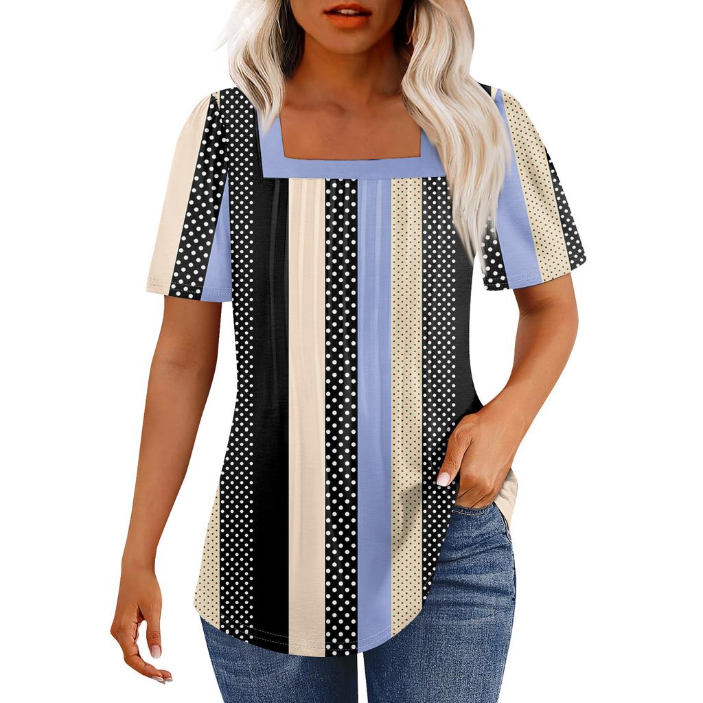 Футболки для женщин, плиссированные, с квадратным вырезом, нарядные, повседневные, блузки с принтом, с коротким рукавом, летние топы свободного кроя