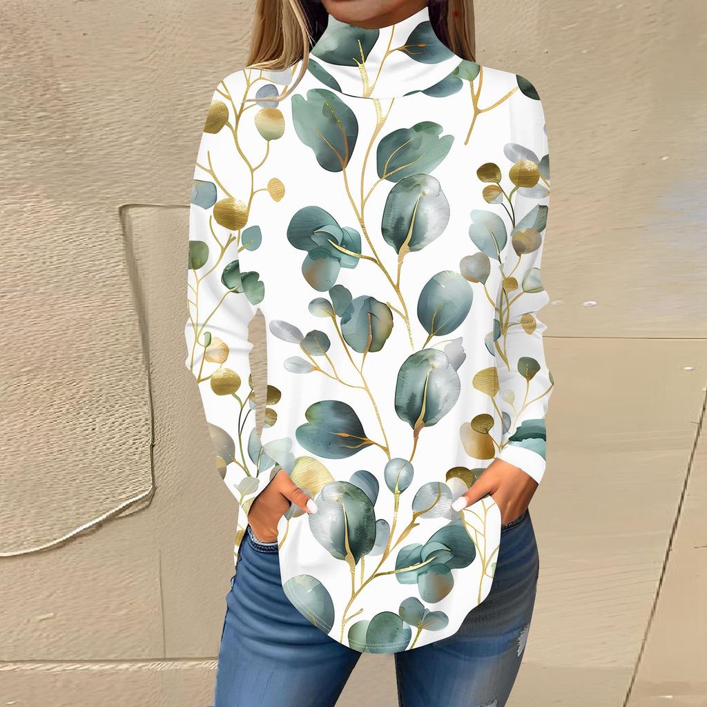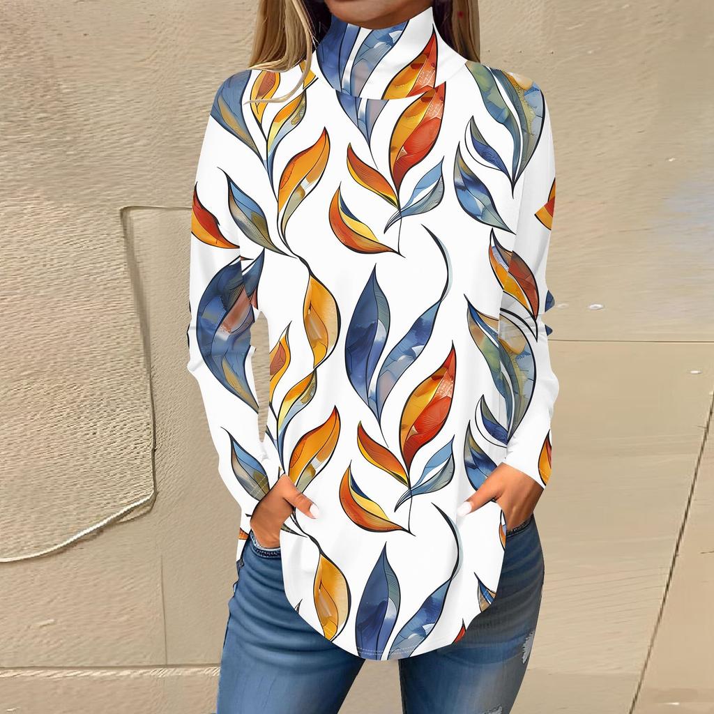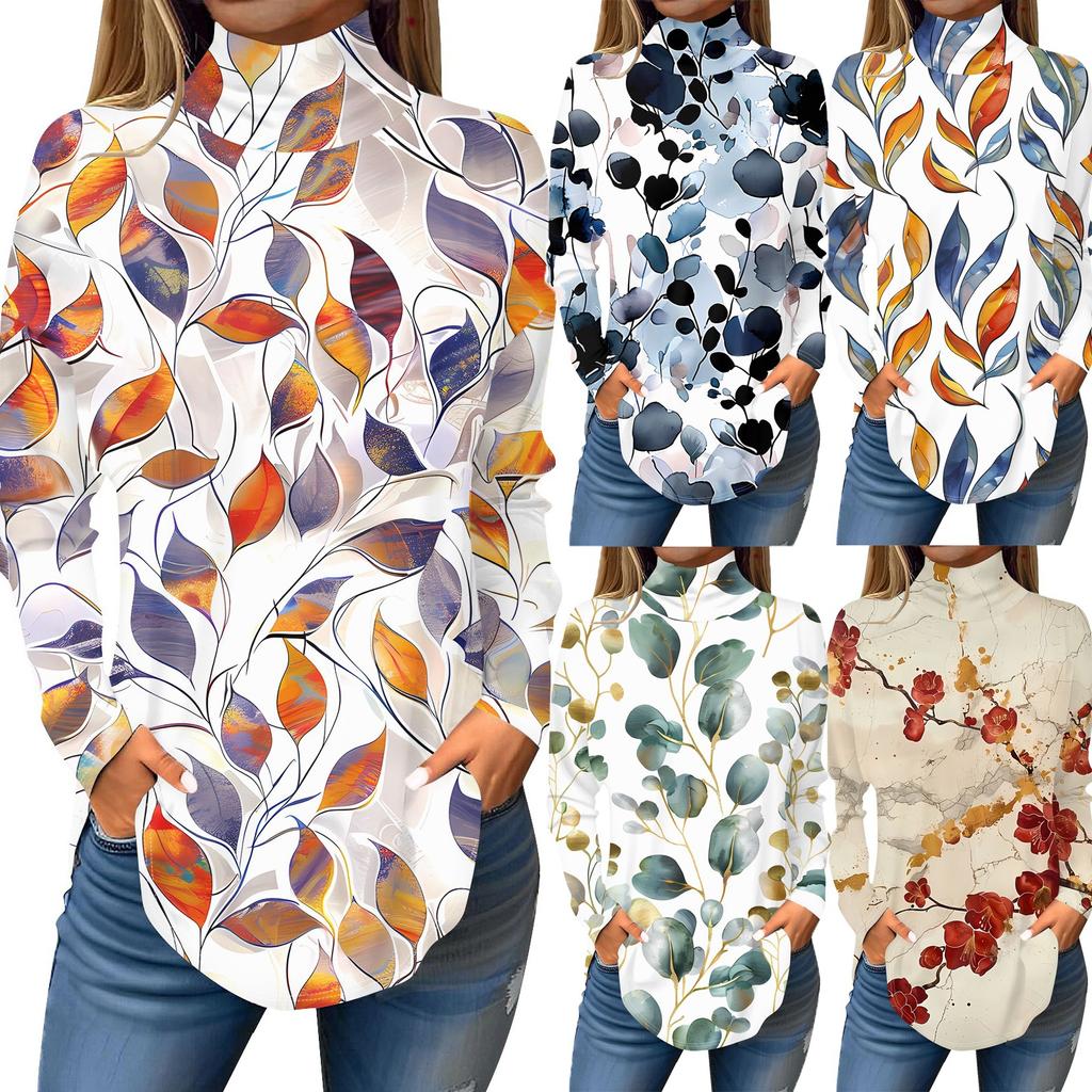 Женская модная повседневная футболка с длинным рукавом с высоким воротом и принтом, пуловер, топ