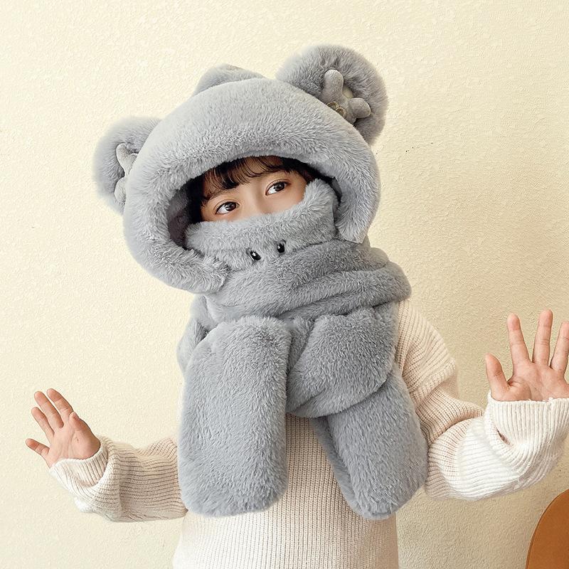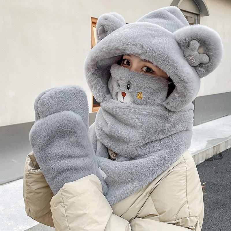 Шапка-медведь женская осенне-зимняя шарф перчатки интегрированный комплект из четырех предметов с капюшоном зимний шарф теплая плюшевая ветрозащитная шапка