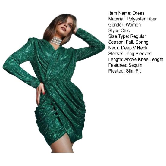 Платье для леди-клуба с глубоким V-образным вырезом, плиссировкой, длинными рукавами и неровным подолом
