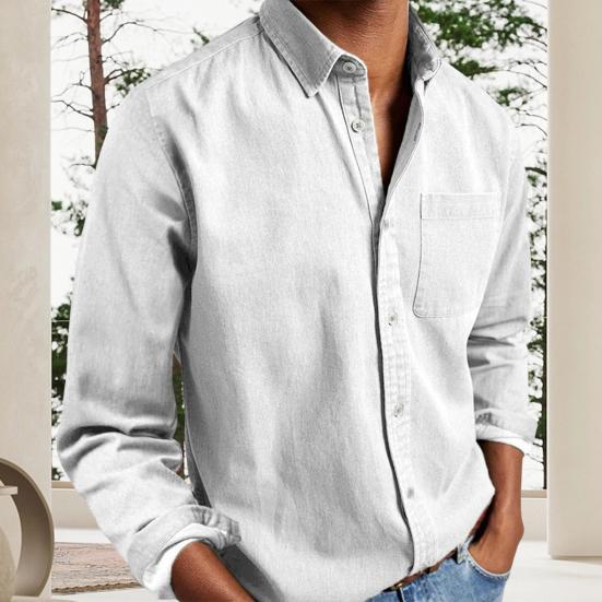 Эта мужская рубашка — универсальная вещь, которую можно легко сочетать с различными мужскими повседневными брюками и джинсами, создавая непринужденный и удобный стиль.. Эта рубашка с простым дизайном и непринужденным внешним видом имеет однобортный лацкан и однотонный цвет, что создает атмосферу непринужденной элегантности..
