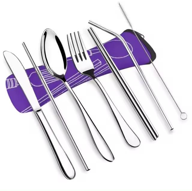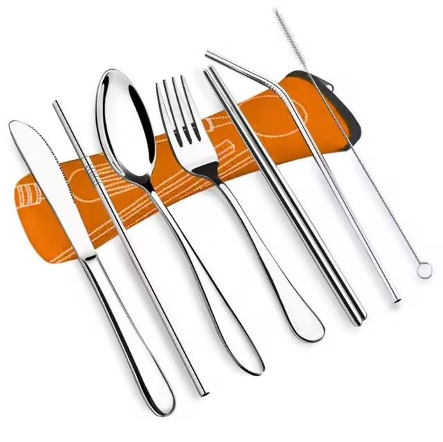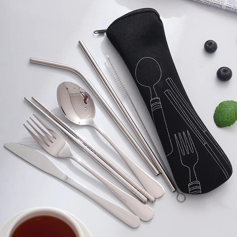 7 шт./компл. набор посуды из нержавеющей стали, портативная тканевая сумка для улицы, нож, вилка, ложка, палочки для еды, соломенные цветы, семь наборов