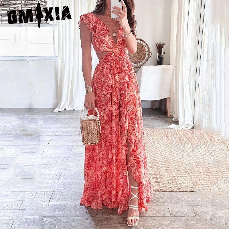 GMXIA Женская мода лето весна цветочный принт без рукавов V-образным вырезом с высокой талией повседневные платья